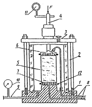 где Dεv - приращение относительной объемной деформации образца. 5.3.7.7 По данным испытаний грунта в условиях трехосного сжатия могут быть определены модуль сдвига G и модуль объемной деформации K в соответствии с приложением И. 5.4 МЕТОД КОМПРЕССИОННОГО СЖАТИЯ 5.4.1 Сущность метода 5.4.1.1 Испытание грунта методом компрессионного сжатия проводят для определения следующих характеристик деформируемости: коэффициента сжимаемости m0, модуля деформации Е, структурной прочности на сжатие рstr, коэффициентов фильтрационной и вторичной консолидации сv и сa для песков мелких и пылеватых, глинистых грунтов с показателем текучести IL > 0,25, органо-минеральных и органических грунтов, относительного суффозионного сжатия esf и начального давления суффозионного сжатия psf для засоленных (содержащих легко- и среднерастворимые соли) песков (кроме гравелистых), супесей и суглинков, 5.4.1.2 Эти характеристики определяют по результатам испытаний образцов грунта в компрессионных приборах (одометрах) или компрессионно-фильтрационных приборах (для определения характеристик суффозионного сжатия), исключающих возможность бокового расширения образца грунта при его нагружении вертикальной нагрузкой. Результаты испытаний должны быть оформлены, как правило, в виде графиков зависимостей деформаций образца от нагрузки и их изменения во времени. Образец должен иметь форму цилиндра диаметром не менее 71 мм и отношение высоты к диаметру 1:3,5. 5.4.2 Оборудование и приборы 5.4.2.1 В состав установки для испытания грунта в условиях компрессионного сжатия должны входить: - компрессионный прибор (одометр), состоящий из рабочего кольца с внутренними размерами по 5.4.1.4, цилиндрической обоймы, перфорированного вкладыша под рабочее кольцо и поддона с емкостью для воды; - механизм для вертикального нагружения образца грунта; - устройства для измерения вертикальных деформаций образца грунта. При определении характеристик суффозионного сжатия применяют компрессионно-фильтрационный прибор, конструкция которого приведена в приложении К. 5.4.2.2 Конструкция компрессионного прибора должна обеспечивать: - подачу воды к образцу снизу и отвод ее; - первоначальную нагрузку на образец, создаваемую весом штампа и закрепленными на нем измерительными приборами не более 0,0025 МПа. Дополнительно к этим требованиям конструкция компрессионно-фильтрационного прибора должна обеспечивать: - подачу воды к образцу грунта снизу (схема восходящего потока) или сверху (схема нисходящего потока); - отвод воды, профильтровавшейся через образец грунта, и накопление ее в мерном сосуде; - непрерывную на протяжении всего испытания фильтрацию воды, герметичность основных деталей прибора. 5.4.2.3 Компрессионные и компрессионно-фильтрационные приборы тарируют на сжатие с помощью металлического вкладыша. Максимальное давление при тарировке принимают равным 1,0 МПа, нагружение ступенями давления - 0,05 МПа с выдержкой по 2 мин. 5.4.3 Подготовка к испытанию 5.4.3.1 Образец грунта изготавливают с учетом требований 5.4.1.4. 5.4.3.2 При испытании для определения характеристик суффозионной сжимаемости дополнительно к физическим характеристикам должны быть определены: коэффициент фильтрации по ГОСТ 25584, количество легко- и среднерастворимых солей (степень засоленности) и их качественный состав (по результатам анализа водной и солян