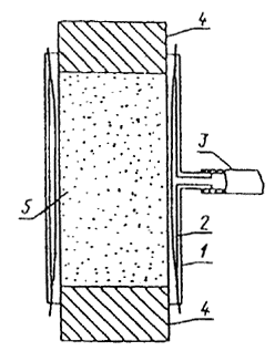 - мерзлый грунт в рабочем кольце срезного прибора устанавливают в опорное кольцо формы второго типа. На это рабочее кольцо устанавливают второе такое же рабочее кольцо и на него помещают защитное кольцо формы второго типа. Верхнее рабочее кольцо заполняют предварительно охлажденным до температуры замерзания грунтовым раствором или грунтом заданного состава и влажности и производят смораживание образца через верхний или нижний торец.