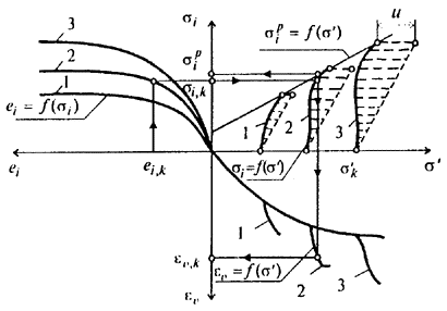 где v - коэффициент поперечной деформации, определяемый по результатам испытаний в приборах трехосного сжатия по 5.3. При отсутствии экспериментальных данных допускается принимать v равным: 0,30 - 0,35 - для песков и супесей; 0,35 - 0,37 - для суглинков; 0,2 - 0,3 при IL < 0; 0,3 - 0,38 при 0 £ IL £ 0,25; 0,38 - 0,45 при 0,25 < IL £ 1,0 - для глин. При этом меньшие значения v принимают при большей плотности грунта. 5.4.7.6 Коэффициент фильтрационной консолидации сv и коэффициент вторичной консолидации сa определяют в соответствии с приложением Н. 5.4.7.7 При определении характеристик суффозионной сжимаемости строят график зависимости относительных деформаций от вертикального давления e = f(p) (приложение П). При этом относительную деформацию образца грунта определяют по формуле (5.10), в которой значение h заменяют hng, где hng - высота образца грунта при давлении, равном напряжению от собственного веса грунта на глубине отбора образца. 5.4.7.8 В случае набухания засоленного грунта при испытании по схеме «трех кривых» необходимо определить свободное относительное набухание εsw по ГОСТ 24143, а точку, соответствующую esw, включить в график ε = f(p), откладывая ее на оси ординат вверх от оси абсцисс. 5.4.7.9 При испытании по схемам «одной кривой» и «трех кривых» характеристики сжатия засоленного грунта природной влажности определяют в соответствии с 5.4.7.4 и 5.4.7.5. 5.4.7.10 При испытании по схеме «одной кривой» относительную просадочность засоленного грунта esl следует определять по ГОСТ 23161. 5.4.7.11 Относительное суффозионное сжатие грунта εsf при испытании по схеме «одной кривой» и при наличии просадочных деформаций следует определять как дополнительное относительное сжатие образца грунта при заданном давлении и непрерывной фильтрации воды по формуле