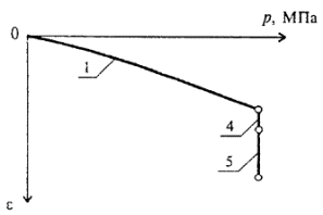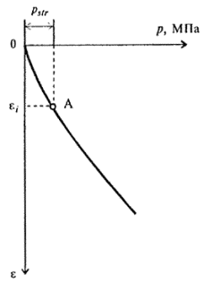 5.4.6.6 За критерий условной стабилизации суффозионного сжатия грунта при заданном давлении р следует принимать приращение относительной деформации Dεsf, не превышающее 0,001 при приращении степени выщелачивания солей Dβt = 0,1, а также при условии, что степень выщелачивания солей βt (5.4.7.17) составляет не менее 0,6. 5.4.6.7 После начала фильтрации воды через образец грунта показания индикаторов деформаций следует регистрировать в первый час через 15 мин, далее через час (но не менее 5 раз) в течение рабочего дня, затем один раз в день при испытании грунтов, содержащих легкорастворимые соли, и один раз в 2 - 3 дня при испытании грунтов, содержащих среднерастворимые соли. 5.4.6.8 В процессе выщелачивания солей необходимо отбирать фильтраты для определения в них количества солей по массе плотного остатка: первый фильтрат - после сбора 50 мл жидкости, второй - через 2 - 3 сут., далее - один раз в неделю при испытании грунтов, содержащих легкорастворимые соли, и один раз в две недели при испытании грунтов, содержащих среднерастворимые соли. 5.4.6.9 После завершения испытания рабочее кольцо с влажным грунтом взвешивают, производят контрольное измерение высоты образца грунта в кольце, определяют влажность грунта и массу сухого грунта, а также количественный и качественный состав солей. 5.4.6.10 В процессе испытания ведут журнал, форма которого приведена в приложении А. 5.4.7 Обработка результатов 5.4.7.1 Для определения характеристик т0, Е и рstr по результатам испытания для каждой ступени нагружения вычисляют: - абсолютную вертикальную стабилизированную деформацию образца грунта Dh, мм, как среднее арифметическое показаний измерительных приборов за вычетом поправки на деформацию компрессионного прибора D; - относительную вертикальную деформацию образца грунта по формуле (5.10). 5.4.7.2 По вычисленным значениям строят график зависимости ε = f(p) (см. приложение Л). Через точки графика проводят осредняющую плавную кривую или аппроксимируют эти точки монотонной зависимостью (например, экспоненциальной в соответствии с приложением М). Значение давления, соответствующее точке пересечения кривой (см. график 1 приложения Л) с осью давления р, равно значению структурной прочности на сжатие рstr. В случае частичного разуплотнения грунта (см. график 2) за рstr принимают абсциссу точки А графика ε = f(p) с ординатой εi = Dhн/h, определенной по формуле (5.23). 5.4.7.3 Вычисляют коэффициенты пористости ei грунта при давлениях pi по формуле еi = е0 - εi(1 + е0). (5.25) 5.4.7.4 Коэффициент сжимаемости т0, МПа-1, в заданном интервале давлений рi и pi+1 вычисляют с точностью 0,001 МПа-1 по формуле