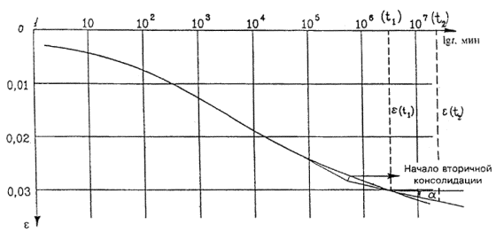 где di,j - диаметр образца в момент догружения, см; di,j-1 - диаметр образца в момент приложения ступени нагружения или предшествующего догружения, см. 6.3.5.6 Продолжительность действия каждой ступени нагружения должна составлять 24 ч. 6.3.5.7 На каждой ступени нагружения записывают показания устройств для измерения деформаций через интервалы времени, принимаемые по 6.1.4.3, и строят график зависимости продольной деформации образца грунта от времени - кривую ползучести (приложение Ц). Скорость деформации считают постоянной, если в трех последовательных интервалах измерений деформация изменяется не более чем на 0,02 мм за 2 ч. 6.3.5.9 В процессе испытания ведут журнал, форма которого приведена в приложении А. 6.3.6.1 К образцу грунта прикладывают нагрузку в соответствии с требованиями 6.3.5.1. 6.3.6.2 Нагрузку на образец на каждой ступени нагружения определяют по 6.3.5.2 - 6.3.5.4. 6.3.6.3 Для обеспечения постоянства осевого напряжения выполняют требования 6.3.5.5. 6.3.6.4 Каждую ступень нагружения выдерживают до условной стабилизации продольной деформации образца грунта, принимаемой по 6.1.4.4, или до достижения стадии незатухающей ползучести. 6.3.6.5 На каждой ступени нагружения записывают показания приборов для измерения деформаций образца грунта через интервалы времени, принимаемые по 6.1.4.3. 6.3.6.6 В процессе испытания ведут журнал, форма которого приведена в приложении А. 6.3.6.7 В процессе испытания для каждой ступени нагружения выполняют следующие операции: - строят кривую ползучести (приложение Ц); - на кривой ползучести выделяют линейные участки, отражающие деформирование образца грунта с постоянной скоростью, если оно имело место при данном значении напряжения; - для выделенных линейных участков определяют значение скорости деформирования образца Vi, мм/ч, по формуле