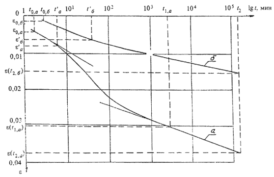 1 Модуль линейной деформации Е и коэффициент нелинейной деформации А определяют по зависимости, устанавливающей связь между относительными продольными деформациями e, напряжениями s и временем действия нагрузки t