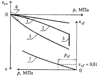 где hр - высота образца грунта природной влажности при заданном давлении, мм. 5.4.7.13 Относительную просадочность esl для различных давлений при испытаниях по схеме «трех кривых» следует определять как разность значений относительного сжатия образцов в водонасыщенном состоянии esat,p и природной влажности ew или разность ординат соответствующих кривых графиков e = f(p). 5.4.7.14 Относительное суффозионное сжатие esf для различных давлений при испытании по схеме «трех кривых» следует определять как разность значений относительного сжатия образцов выщелоченного грунта и в водонасыщенном состоянии или разность ординат соответствующих кривых графика e = f(p). По значениям esf следует строить график зависимости относительного суффозионного сжатия от давления (приложение П). 5.4.7.15 Начальное давление суффозионного сжатия рsf следует определять по графику зависимости относительного суффозионного сжатия от давления esf = f(p), принимая за рsf давление, при котором относительное суффозионное сжатие составляет 0,01. 5.4.7.16 Относительное суффозионное сжатие вычисляют с точностью 0,001, начальное давление суффозионного сжатия - с точностью 0,02 МПа. 5.4.7.17 В процессе компрессионно-фильтрационного испытания грунта при непрерывной фильтрации воды и заданном давлении р следует строить график зависимости относительного суффозионного сжатия esf от степени выщелачивания солей bt, д.е., (приложение П), определяемой по формуле где k - число определений плотного остатка фильтрации за время испытаний; Vw - объем воды, профильтровавшейся через образец грунта за период между двумя последующими определениями плотного остатка, л;