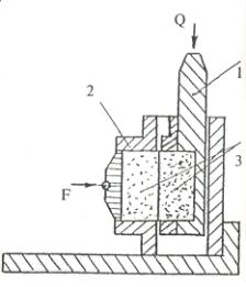 1 - подвижная часть прибора (срезная каретка); 2 - неподвижная часть прибора (корпус); 3 - образец; Q - касательная нагрузка; F - нормальная нагрузка