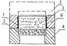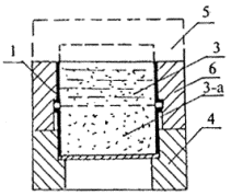 1 - рабочее кольцо срезного прибора; 2 - материал; 3 - грунт (лед, грунтовый раствор); 3-а - грунт; 4 - опорное кольцо; 5 - крышка формы; 6 - защитное кольцо формы