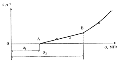 где s1 - напряжение, соответствующее точке А пересечения линейного участка реологической кривой (6.3.6.8) с осью абсцисс, МПа; s2 - напряжение, соответствующее конечной точке В линейного участка реологической кривой, МПа;