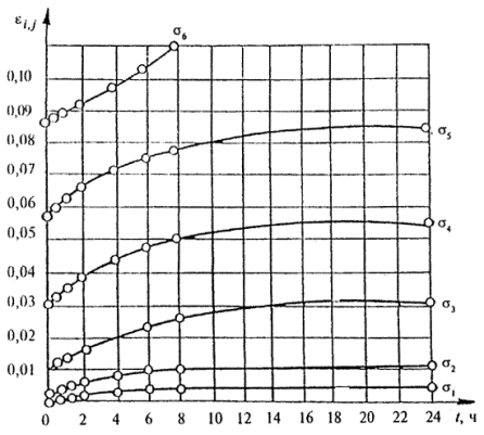 3 Для установления зависимости (Ш.1) исходные данные испытаний (6.3.5) обрабатывают в соответствии с теорией наследственной ползучести. Используя кривую ползучести (6.3.5.7), последовательно вычисляют ряд значений ei,j, имеющих смысл деформаций, которые развились бы под действием постоянного напряжения (i = l, 2,...), соответствующего напряжению i-й ступени нагружения, за время tj. Вычисления проводят по формуле