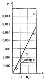 9 Параметр с уравнения прямой, проходящей через начало координат у = сх, определяют графически (рисунок Ш.3), при этом с в масштабе чертежа равен тангенсу угла наклона к оси абсцисс (х) прямой наилучшего приближения к экспериментальным точкам, проходящей через начало координат.