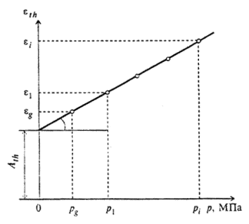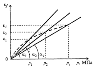 где Dhi - абсолютная стабилизированная деформация образца грунта после оттаивания, мм; Dhg - абсолютная стабилизированная деформация образца грунта на первой ступени нагружения (при давлении, равном напряжению от собственного веса грунта на глубине отбора образца, и до его оттаивания), мм; h - высота образца грунта после обжатия (до его оттаивания), мм. 6.4.5.2 По вычисленным значениям строят графики зависимости εf = f(p) или εth = f(p) (приложение Щ), где р - давление в образце на каждой ступени нагружения, МПа. 6.4.5.3 Коэффициенты сжимаемости пластично-мерзлого грунта mf,i, МПа-1, определяют как величины, численно равные тангенсам углов наклона аi прямых, проведенных из начала координат через точки рi и εf,i с точностью 0,001 МПа-1 по формуле