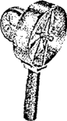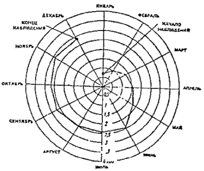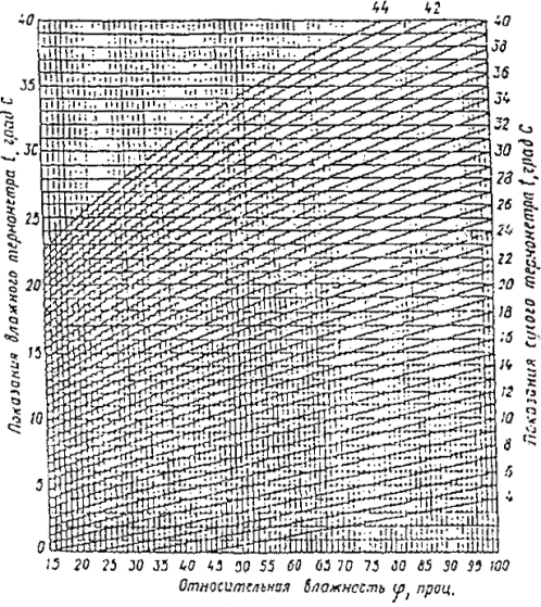 Рис. 3.3. Метеорологический термограф Рис. 3.4. Метеорологический гигрограф 3.2.7. С помощью психрометра Ассмана относительная влажность воздуха определяется по показаниям двух термометров: сухого и влажного (смоченного, обернутого влажной материей). Интенсивность испарения воды поверхности смоченного термометра зависит от влажности окружающего воздуха: чем меньше его относительная влажность, тем быстрее вода испаряется и тем ниже показания термометра. Разность показаний сухого и смоченного термометров характеризует относительную влажность среды. Для получения численного значения относительной влажности служит психрометрический график, прилагаемый к каждому прибору. Относительная влажность воздуха может быть определена по гигрометрическим таблицам или по психрометрическому графику, приведенному на рис. 3.5. Пример. Показания психрометра Ассмана: tсух= +24°С; tвл= +18°С; определить относительную влажность воздуха j, %. Отыскиваем на оси ординат графика (см. рис. 3.5) точку, соответствующую tвл 18°С и проводим из нее горизонтальную линию до пересечения с кривой, соответствующей tсух =24°С. Из точки пересечения опускаем вертикаль и получаем на оси абсцисс точку, соответствующую искомой относительной влажности j=56 %. 3.2.8. Радиационную обстановку помещения устанавливают на основе измерения результирующей температуры tR при помощи шарового термометра Вернона-Йокла (рис. 3.9). Результирующая температура сочетает воздействия температуру внутреннего воздуха tin, температуры окружающих поверхностей и источников теплового излучения и скорости движения воздуха. Радиационную температуру tsq при малых скоростях потока воздуха определяют по формуле tsq=2tш-tin, где tш - показания шарового термометра, °С. Рис. 3.5. График определения относительной влажности воздуха Рис. 3.6. Анемометры а - крыльчатый; б - чашечный Рис. 3.7. Кататермометр Рис. 3.8. Фумигатор Рис. 3.9. Шаровой термометр Шаровой термометр представляет собой окрашенный в черный цвет полый медный шар диаметром 150 мм, одна половина которого имеет зеркальную поверхность (степень черноты поверхности не выше 0.05), а другая зачернённую поверхность. Внутри в центре шара помещён либо обычный ртутный термометр, либо термоэлектрический преобразователь. Измеряемая внутри шара температура является равновесной температурой от лучистого теплообмена между шаром и окружающей средой. Влияние радиации на зачерненную поверхность приводит к тому, что температура воздуха внутри шара отличается от температуры воздуха, замеренной сухим термометром аспирационного психрометра Ассмана. Время нахождения шарового термометра в точке замера перед снятием показаний не менее 20 мин. 3.2.9. Результаты измерений температур и относительной влажности заносятся в табл. 3.1, составляемую в прилагаемой форме. По данным этой таблицы подсчитываются все показатели, получаемые при обработке данных измерений (средние арифметические, абсолютные, суточные и часовые амплитуды, средние квадратические отклонения и т.д.). 3.2.10. В зависимости от температуры и относительной влажности воздуха температурно-влажностный режим помещения в холодный период года подразделяется на сухой, нормальный, влажный и мокрый (табл. 3.2). В летний период года температура в помещениях повышается, а относительная влажность падает по сравнению со значениями этих 