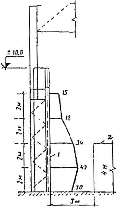 Рис. 3.12. Актинометр для измерения интенсивности теплового потока Измерения температур, интенсивности теплового излучения и параметров внутреннего воздуха производятся перед началом воздействия источника, в течение времени воздействий (2-4 измерения) и после окончания до стабилизации температур. 3.3.7. При оценке общего терморадиационного режима помещений и воздействия теплового излучения на человека измерения производятся на постоянных рабочих местах и по объему помещения на различном удалении от источника с таким расчетом, чтобы охватить зону с величиной интенсивности излучения не менее 350 Вт/м2, при этом приемная поверхность актинометра располагается перпендикулярно потоку излучения. 3.3.8. При оценке воздействия теплового излучения на строительные конструкции актинометрические измерения производятся непосредственно около поверхностей конструкций; приемная поверхность актинометра устанавливается параллельно поверхностям конструкций. 3.3.9. Одновременно с измерениями интенсивности излучения выполняются измерения температур поверхностей конструкций, температуры и скорости движения воздуха непосредственно около конструкций. При этом составляется подробная схема измерений с указанием размеров источника и приемника излучения и расстояний, необходимых для фиксации их взаимного расположения. Здесь же характеризуется состояние поверхности приемника (например, «окрашена алюминиевой краской или окислена» и т.п.). Результаты измерений заносятся в табл. 3.4. 3.3.10. На основе измерений строятся изоактины - линии равной интенсивности теплового излучения, Вт/м2, в плане и по вертикали помещения и хроноактинограммы - графики изменения интенсивности излучения во времени для характерных пунктов помещения. По результатам измерений строятся также актинограммы облученности конструкций, Вт/м2, путем нанесения на чертеже с сечением конструкции по нормали к поверхностям величин облученности (рис. 3.13). 3.3.11. Результаты измерений интенсивности теплового излучения сопоставляются с требованиями санитарных норм и норм проектирования строительных конструкций, и на этой основе разрабатываются рекомендации по обеспечению условий труда и долговечности строительных конструкций. Рис. 3.13. Актинограмма стальной колонны на складе слябов 1 - плоскость измерений; 2 - штабели слябов (температура 860 °С) Таблица 3.4 Форма для записи результатов обследования теплового излучения