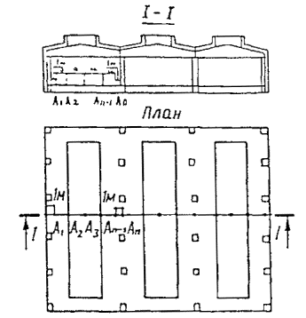 Пояснения к заполнению таблицы: В названии таблицы указываются характер производимого обследования, наименование предприятия, цеха, отделения и конструктивного элемента здания. В графах 8, 9, 10, 12 записываются результаты измерений температуры и скорости движения воздуха в единицах, в которых градуирован прибор. В примечаниях указываются тип, номер прибора и датчика температуры. 3.4. Освещенность помещений3.4.1. Требуемый уровень освещенности помещения зависит от назначения помещения, характера выполнения зрительной работы и регламентируется СНиП 23-05-95. Помещения с постоянным пребыванием людей должны иметь, как правило, естественное освещение. 3.4.2. Естественное освещение подразделяется на боковое, верхнее и комбинированное (верхнее и боковое). 3.4.3. Освещенность помещения естественным светом характеризуется коэффициентом естественной освещенности (КЕО) ряда точек, расположенных в пересечениях двух плоскостей: вертикальной плоскости характерного разреза помещения и плоскости, принимаемой за условную рабочую плоскость помещения. Естественное освещение, в какой-либо точке М помещения характеризуется КЕОм. Он определяется как отношение естественной освещенности в некоторой точке заданной плоскости внутри помещения Ем светом неба (непосредственно или после отражений) к значению в тот же момент времени наружной горизонтальной освещенности Ен, создаваемой светом равнояркого небосвода, что характерно для условий сплошной облачности Ем= Неравномерность естественного освещения характеризуется соотношением наибольшего и наименьшего значений КЕО, определенных по кривой его распространения в пределах характерного разреза помещения. 3.4.4. Характерный разрез помещения - поперечный разрез по середине помещения, плоскость которого перпендикулярна плоскости остекления световых проемов (при боковом освещении) или продольных осей пролетов помещения (при верхнем освещении). В характерный разрез помещения должны попадать участки, наиболее загруженные оборудованием, а также рабочие зоны, наиболее удаленные от световых проемов. Условная рабочая поверхность - условно принятая горизонтальная поверхность, расположенная на высоте 0,8 м от пола. Рабочая поверхность - поверхность, на которой производится работа и на которой нормируется и измеряется освещенность (поверхность стола верстака) части оборудования, на которой производятся работы. 3.4.5. В помещениях с боковым освещением нормируется минимальное значение КЕО (ем) в пределах рабочей зоны, а с верхним или комбинированным освещением - среднее значение КЕО (еср) в пределах рабочей зоны, определяемое по формуле еср= где n - количество точек измерений освещенности (не менее 5); l1, l2, ln - значения КЕО в отдельных точках, находящихся на равных расстояниях друг от друга 3.4.6. При боковом освещении измерения освещенности необходимо произвести в точках характерного разреза помещения согласно схеме, приведенной на рис. 3.14, а при верхнем и комбинированном освещении - в точках характерного разреза помещения согласно схеме рис. 3.15. При этом точки замеров (в количестве не менее 5) следует принимать на равных расстояниях друг от друга, располагая первую и последнюю точки на расстоянии 1 м от стен (или осей средних рядов колонн). В обследуемом помещении намечается ряд характерных разрезов, перпендик