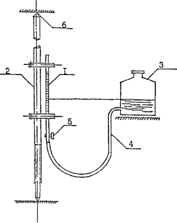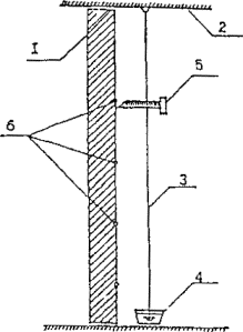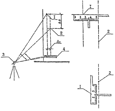 Рис. 5.1. Измерение отклонений от вертикали конструкций с помощью отвеса 1 - стена, перегородка или колонна; 2 - перекрытие; 3 - отвес; 4 - сосуд с водой; 5 - измерительная линейка; 6 - точка измерения Смещения по горизонтали от опорных точек, а также вертикальные перемещения определяются измерениями с помощью мерной ленты, линейки иди геодезической съемкой (рис. 5.2). С помощью теодолитов могут быть измерены также наклоны и выпучивания стен и других вертикально расположенных конструкций. 5.2.3. Величины прогибов, искривлений конструкций и их элементов измеряются путем натяжения тонкой проволоки между краями конструкции или ее частями, не имеющими деформации, и измерения максимального расстояния между проволокой и поверхностью конструкции с помощью линейки. Рис. 5.2. Измерение горизонтального и вертикального смещения двух точек с помощью теодолита 1,2 - точки; 3 - теодолит, 4 - переносная линейка Величины прогибов могут быть определены также с помощью прогибомеров и гидростатического уровня (рис. 5.3, 5.4). При использовании прогибомеров измеряется величина перемещения элемента, закрепленного на деформирующемся участке конструкции, относительно неподвижного элемента. В качестве прогибомера могут быть использованы две планки или система, передающая перемещения от недеформируемой конструкции на измерительный прибор, в качестве которого обычно используется индикатор часового типа (мессура). Рис. 5.3. Схема измерения прогибов гидростатическим уровнем 1 - градуированная трубка; 2- телескопическая стойка; 3- сосуд; 4- резиновый шланг; 5 - краник; 6 - точка измерения Рис. 5.4. Прогибомер П-1 1 - мерный диск; 2 - металлическая трубка; 3 - стеклянная трубка со шкалой; 4 - окуляр; 5 - резиновая трубка; 6 - зажим; 7 – шток; 3 - пробка При малых линейных деформациях растяжения или сжатия измерение прогибов элементов производится при помощи тензометров, а сдвиги и повороты - геодезической съемкой. 5.2.4. Деформацию перекрытий определяют прогибомером П-1 (см. рис. 5.4) или нивелиром НВ-1 со специальной насадкой. Перед началом замеров шток устанавливают в такое положение, чтобы показания в мерной трубке соответствовали нулю. Затем трубку с диском передвигают по поверхности потолка; через каждый полный поворот диска снимают отсчеты по мерной трубке. Прогибы замеряют в различных точках потолка. Таким же образом прогибомером П-1, нивелиром НВ-1 измеряют прогибы несущих элементов лестниц - балок, маршей и плит. 5.2.5. Определение кинетики развития деформаций осуществляется путем многократных их измерений через определенные интервалы времени (от одних до 30 суток) в зависимости от скорости развития деформации. 5.2.6. Основной причиной появления общих деформаций зданий и сооружений являются неравномерные осадки грунтов оснований, что является следствием, как правило, изменения гидрогеологических условий, чрезмерного увлажнения грунтов, надстройки существующего здания без учета несущей способности фундаментов и т.п. 5.2.7. Наблюдения за деформациями зданий и сооружений, находящихся в эксплуатации, проводят в случаях появления трещин, раскрытия швов, перемещения и наклона строительных конструкций, а также резкого изменения условий эксплуатации. Цель наблюдения за деформациями состоит в том, чтобы установить, стабилизировались или продолжают развиваться осадки здания и другие изменени