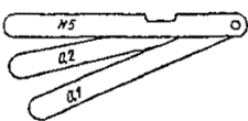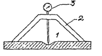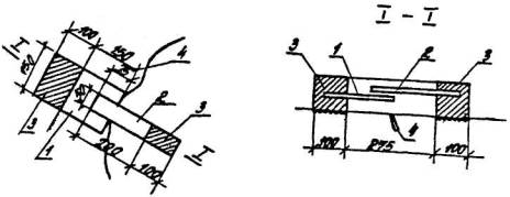 Рис. 5.7. Пластинчатый маяк из двух окрашенных пластинок 1 - пластинка, окрашенная в белый цвет; 2 - пластинка, окрашенная в красный цвет; 3 - гипсовые плитки; 4 - трещина Рис. 5.8. Щелемер конструкции ЛенГИДЕПА 1 - скоба; 2 - измерительная шкала; 3 - трещина; 4 - зачеканка Рис. 5.9. Маяк конструкции Ф.А. Белякова 5.3.15. Щелемер, у которого счетным механизмом служит мессура, схематически показан на рис. 5.10. Данные измерений по мессуре увязываются с температурой воздуха, на которую вводится соответствующая поправка; окончательную величину отсчета S, мм, определяют по формуле S=F-klt, где F - отсчет по мессуре, мм; k - коэффициент линейного расширения металла плеча мессуры; t - температура воздуха в момент отсчета; l - длина плеча мессуры, мм. 5.3.16. Щелемер для длительных наблюдений показан на рис. 5.11. Он состоит из двух марок, каждая из которых представляет собой цилиндр из некорродирующего металла с полушаровой головкой, укрепленной на квадратном фланце из листовой стали. Для закрепления фланца в бетоне к нему приваривается анкерная скоба. Пара таких марок устанавливается по обе стороны трещины. Измерение расстояния между марками во время каждого осмотра производится штангенциркулем дважды: в обхват цилиндров и в обхват полушаровых головок с упором ножек штангенциркуля в торцы цилиндров. Однозначность изменений расстояний по обеим измерениям между циклами укажет на отсутствие ошибок при производстве замеров. Рис. 5.10. Щелемер с мессурой 1 - мессура; 2 - трещина Рис. 5.11. Щелемер для длительных наблюдений 1 - марка; 2 - фланец; 3 - анкерная плита 5.3.17. Щелемер для измерения деформаций широких швов схематически показан на рис. 5.12. Он состоит из двух отрезков уголкового железа (100´100´100 мм), прикрепленных к обеим сторонам шва при помощи анкерных болтов. К концам уголков прикрепляются две фасонные пластинки из некорродирующего металла. При деформациях шва пластинки скользят одна по другой. Деформацию шва определяют как разность расстояний между вертикальными плоскостями пластинок в отдельных циклах измерений. Рис. 5.12. Щелемер для измерения широких трещин и швов 5.3.18. Для наблюдений за трещинами и осадками в стенах применяют стрелочно-рычажное устройство, схематически показанное на рис. 5.13. Оно состоит из деревянной или металлической стрелки длиной 0,7-1 м, шарниров и мерной шкалы. Шарниры, закрепляющие стрелку на стене, расположены по обе стороны от трещины. Длина остальной свободной части стрелки в 10 раз больше расстояния между указанными шарнирными креплениями. Таким образом, вертикальному смещению одного шарнира относительно другого соответствует в 10 раз большее смешение вверх или вниз конца стрелки над мерной шкалой (металлической или деревянной рейкой). В этих условиях величина осадок по обе стороны трещины в 1 мм соответствует смещению конца стрелки на 10 мм. При установке прибора на стене свободный конец стрелки помещается над нулевым делением мерной шкалы. 5.3.19. В журнале наблюдений фиксируются: номер и дата установки маяка или щелемера, место и схема их расположения, первоначальная ширина трещины, изменение со временем длины и глубины трещины. По данным измерений строят график хода раскрытия трещин (рис. 5.14.). В случае деформации маяка рядом с ним устанавливается новый, которому присваивается тот же номер, но с индексом. Маяки, на которых появились трещины, не у
