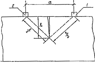 где t - время распространения ультразвука, мкс; l - расстояние между центрами установки преобразователей (база прозвучивания), мм. При измерении времени распространения ультразвука способом поверхностного прозвучивания ультразвуковые преобразователи устанавливают на одной стороне образца или конструкции по схеме, приведенной на рис. 6.18. 6.4.5. Число измерений времени распространения ультразвука в каждом образце должно быть: при сквозном прозвучивании - 3, при поверхностном - 4. Отклонение отдельного результата измерения времени распространения ультразвука в каждом образце от среднего арифметического значения результатов измерений для данного образца, не должно превышать 2 %. Измерение времени распространения ультразвука и определение прочности бетона производятся в соответствии с указаниями паспорта (технического условия применения) данного типа прибора и указаний ГОСТ 17624-87. 6.4.6. На практике нередки случаи, когда возникает необходимость определения прочности бетона эксплуатируемых конструкций при отсутствии или невозможности построения градуировочной таблицы. В этом случае определение прочности бетона проводят в зонах конструкций, изготовленных из бетона на одном виде крупного заполнителя (конструкции одной партии). Скорость распространения ультразвука V определяют не менее чем в 10 участках обследуемой зоны конструкций, по которым определяют среднее значение V. Далее намечают участки, в которых скорость распространения ультразвука имеет максимальное Vmax и минимальное Vmin значения, а также участок, где скорость имеет величину Vn наиболее приближенную к значению V, а затем выбуривают из каждого намеченного участка не менее чем по два керна, по которым определяют значения прочности в этих участках: Rmax, Rmin, Rn соответственно. Прочность бетона RH определяют по формуле