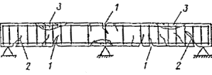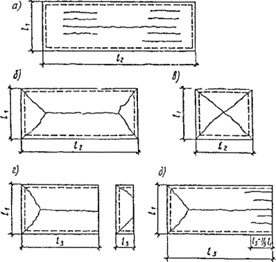 Рис. 6.1. Характерные трещины в изгибаемых железобетонных элементах, работающих по балочной схеме 1 - нормальные трещины в зоне максимального изгибающего момента; 2 - наклонные трещины в зоне максимальной поперечной силы; 3 - трещины и раздробление бетона, в сжатой зоне элемента Нормальные трещины имеют максимальную ширину раскрытия в крайних растянутых волокнах сечения элемента. Наклонные трещины начинают раскрываться в средней части боковых граней элемента - в зоне действия максимальных касательных напряжений, а затем развиваются в сторону растянутой грани. Образование наклонных трещин на опорных концах балок и прогонов свидетельствует о недостаточной их несущей способности по наклонным сечениям. Вертикальные и наклонные трещины в пролетных участках балок и прогонов свидетельствуют о недостаточной их несущей способности по изгибающему моменту. Раздробление бетона сжатой зоны сечений изгибаемых элементов указывает на исчерпание несущей способности конструкции; б) в плитах возникают следующие трещины: в средней части плиты, имеющие направление поперек рабочего пролета с максимальным раскрытием на нижней поверхности плиты; на опорных участках, имеющие направление поперек рабочего пролета с максимальным раскрытием на верхней поверхности плиты; радиальные и концевые, с возможным отпаданием защитного слоя и разрушением бетона плиты; вдоль арматуры по нижней плоскости стены. Трещины на опорных участках плит поперек рабочего пролета свидетельствуют о недостаточной несущей способности по изгибающему опорному моменту. Характерно развитие трещин силового происхождения на нижней поверхности плит с различным соотношением сторон (рис. 6.2). При этом бетон сжатой зоны может быть не нарушен. Смятие бетона сжатой зоны указывает на опасность полного разрушения плиты; Рис. 6.2. Характерные трещины на нижней поверхности плит а - работающих по балочной схеме при l2/l1£3; б - опертых по контуру при l2/l1<3; в - тоже при l2/l1=1; г - опертых по трем сторонам при l3/l1£1,5; д - то же, при l2/l1>1,5 в) в колоннах образуются вертикальные трещины на гранях колонн и горизонтальные. Вертикальные трещины на гранях колонн могут появляться в результате чрезмерного изгиба стержней арматуры. Такое явление может возникнуть в тех колоннах и их зонах, где редко поставлены хомуты (рис. 6.3). Горизонтальные трещины в железобетонных колоннах не представляют непосредственной опасности, если ширина их невелика, однако через такие трещины могут в арматуру попасть увлажненный воздух и агрессивные реагенты, вызывая коррозию металла. Появление продольных трещин вдоль арматуры в сжатых элементах свидетельствует о разрушениях, связанных с потерей устойчивости (выпучиванием) продольной сжатой арматуры из-за недостаточного количества поперечной арматуры; Рис. 6.3. Трещины вдоль продольной арматуры в сжатых элементах Рис. 6.4. Трещины по всей высоте сечений элементов, изгибаемых в двух плоскостях Рис. 6.5. Трещины в опорной части предварительно напряженного элемента 1 - при нарушении анкеровки напряженной арматуры; 2 - при недостаточности косвенного армирования сечения на действие усилия обжатия Рис. 6.6. Характерные повреждения силового происхождения в железобетонных фермах с нижним предварительно напряженным поясом 1 - наклонная трещина опорного узла; 2 - откол лещадок; 3 - лучеоб