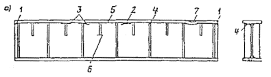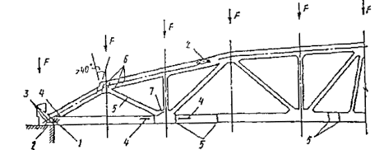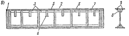 Рис. 8.3. Характер повреждения сварной (а) и клепаной (б) сплошностенчаных подкрановых балок При прогибе балки происходит поворот ее опорного сечения вокруг края фактической опоры (по грани колонны), вследствие чего верх торца балки несколько приподнимается. При переходе катка крана с одной балки на другую увеличивается динамический эффект нагрузки. Конец сварного шва у торца балки является концентратором напряжений. Совокупность вышеуказанных факторов и является причиной возникновения трещин у торцов балки. Такие же повреждения часто появляются между ребрами жесткости 2. Они начинаются в сварном шве или околошовной зоне и, развиваясь с течением времени, достигают длины 1-3 м, и часто распространяются на стенку. Местный крутящий момент, от внецентренного приложения вертикальных давлений вызывает растягивающие напряжения на одной из сторон стенки балки и способствует усталостному ее разрушению. Довольно часто продольные трещины в стенке у верхнего пояса сварных балок появляются около ребер жесткости 3, чему способствуют концентрация напряжений у ребер, а также остаточные сварочные напряжения. Во многих случаях в сварных балках появляются трещины 4 на конце ребер жесткости по сварному шву или по металлу ребра вблизи шва, прикрепляющего ребро к верхнему поясу. Иногда эти трещины распространяются с ребра на металл стенки балок. Основной причиной появления трещин типа 4 являются воздействия в верхнем поясе местных крутящих моментов, возникающих от вышеуказанных причин. Поперечные трещины в верхних поясных листах 5 возникают у отверстий, в листах верхнего пояса, служащих для креплений рельсов, и постепенно распространяются к краю пояса балки. Часто трещины в стенке балки появляются у концов коротких ребер жесткости 6, такие трещины возникают преимущественно в высоких балках с относительно гибкой стенкой при пролетах 12 м и более. Местные прогибы верхних поясов ферм 7 являются следствием нарушения правил эксплуатации при использовании балок для зачаливания блоков и тросов при подъеме и перемещении оборудования. 8.1.19. При обследовании подкрановых конструкций проверяются: состояние верхнего пояса шва и околошовной зоны, в первую очередь на предмет выявления трещин. Появление трещин разных направлений возможно в верхней части стенки, а также под коротким ребром жесткости. Желательно осмотр этих участков проводить с обеих сторон балки. Тщательный осмотр этих мест производится по всей длине подкрановых балок; выполнение требований к качеству и расположению заводских стыков швов поясов и стенок балок, швов приварки ребер жесткости. В неразрезных балках особое внимание уделяется швам в монтажных стыках; местные прогибы и искривления элементов, наличие грибовидных поясов, погнутости их между ребрами жесткости; состояние соединения тормозных конструкций с верхним поясом балок. Необходимо проверить наличие швов сверху и снизу листа, продольных трещин в листе или по шву; узлы примыкания тормозных конструкций к колоннам (наличие разрушенных швов или болтовых соединений); узлы соединения балок между собой на опорах, а также с колоннами. Конструктивные решения этих узлов разнообразны, что определяет разнообразие видов их повреждений; состояние нижних опорных узлов подкрановых балок, анкерных болтов, прокладок. Особое вним