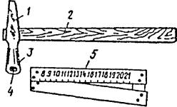 Рис. 6.7. Молоток И.А. Физделя 1 - молоток; 2 - ручка; 3 - сферическое гнездо; 4 - шарик; 5 - угловой масштаб Рис. 6.8. Тарировочный график для определения предела прочности бетона при сжатии молотком Физделя Рис. 6.9 Определение прочности материала, с помощью молотка К.П. Кашкарова 1 - корпус, 2 - метрическая рукоятка; 3 - резиною ручка; 4 - головка; 5 - стальной шарик, 6 - стальной эталонный стержень; 7- угловой масштаб Рис. 6.10. Тарировочная кривая для определения прочности бетона молотком Кашкарова На рис. 6.8 приведена тарировочная кривая для определения предела прочности при сжатии молотком Физделя. 6.3.4. К методике определения прочности бетона, основанной на свойствах пластических деформаций, относится также молоток Кашкарова ГОСТ 22690-88. Отличительная особенность молотка Кашкарова (рис. 6.9) от молотка Физделя заключается в том, что между металлическим молотком и завальцованным шариком имеется отверстие, в которое вводится контрольный металлический стержень. При ударе молотком по поверхности конструкции получаются два отпечатка: на поверхности материала с диаметром dd и на контрольном (эталонном) стержне с диаметром dэ. Отношение диаметров получаемых отпечатков зависит от прочности обследуемого материала и эталонного стержня и практически не зависит от скорости и силы удара, наносимого молотком. По среднему значению величины dd/dэ из тарировочного графика (рис. 6.10) определяют прочность материала. На участке испытания должно быть выполнено не менее пяти определений при расстоянии между отпечатками на бетоне не менее 30 мм, а на металлическом стержне - не менее 10 мм. 6.3.5. К приборам, основанным на методе упругого отскока, относятся пистолет ЦНИИСКа (рис. 6.11), пистолет Борового (рис. 6.12), молоток Шмидта, склерометр КМ со стержневым ударником и др. Принцип действия этих приборов основан на измерении упругого отскока ударника при постоянной величине кинетической энергии металлической пружины. Взвод и спуск бойка осуществляются автоматически при соприкосновении ударника с испытываемой поверхностью. Величину отскока бойка фиксирует указатель на шкале прибора. Рис. 6.11. Пистолет ЦНИИСКа и Рис. 6.12. Пружинный пистолет С.И. Борового для определения прочности бетона неразрушающим методом 1 - ударник, 2 - корпус, 3 - шкала, 4 - фиксатор показания прибора, 5 - рукоятка К современным средствам по определению прочности бетона на сжатие неразрушающим ударно-импульсным методом относится прибор ОНИКС-2.2, принцип действия которого заключается в фиксации преобразователем параметров кратковременного электрического импульса, возникающего в чувствительном элементе при ударе о бетон, с его преобразованием в значение прочности. После 8-15 ударов на табло выдается среднее значение прочности. Серия измерений завершается автоматически после 15-го удара и на табло прибора выдается среднее значение прочности. Отличительная особенность склерометра КМ заключается в том, что специальный боек определенной массы при помощи пружины с заданной жесткостью и предварительным напряжением ударяет по концу металлического стержня, называемого ударником, прижатого другим концом к поверхности испытываемого бетона. В результате удара боек отскакивает от ударника. Степень отскока отмечается на шкале прибора при помощи специального указателя. Зависимость величины отскока ударника от про