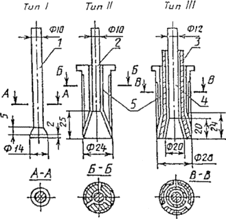 Рис. 6.13. Схема испытания методом отрыва со скалыванием при использовании анкерных устройств При испытании методом отрыва со скалыванием участки должны располагаться в зоне наименьших напряжений, вызываемых эксплуатационной нагрузкой или усилием обжатия предварительно напряженной арматуры. Прочность бетона на участке допускается определять по результатам одного испытания. Участки для испытания следует выбирать так, чтобы в зону вырыва не попала арматура. На участке испытания толщина конструкции должна превышать глубину заделки анкера не менее чем в два раза. При пробивке отверстия шлямбуром или высверливанием толщина конструкции в этом месте должна быть не менее 150 мм. Расстояние от анкерного устройства до грани конструкции должно быть не менее 150 мм, а от соседнего анкерного устройства - не менее 250 мм. 6.3.7. При проведении испытаний используются анкерные устройства трех типов (рис. 6.14). Анкерные устройства типа I устанавливают на конструкции при бетонировании; анкерные устройства типов II и III устанавливают в предварительно подготовленные шпуры, пробитые в бетоне высверливанием. Рекомендуемая глубина отверстий: для анкера типа II - 30 мм; для анкера типа III - 35 мм. Диаметр шпура в бетоне не должен превышать максимальный диаметр заглубленной части анкерного устройства более чем на 2 мм. Заделка анкерных устройств в конструкциях должна обеспечить надежное сцепление анкера с бетоном. Нагрузка на анкерное устройство должна возрастать плавно со скоростью не более 1,5-3 кН/с вплоть до вырыва его вместе с окружающим бетоном. Рис. 6.14. Типы анкерных устройств 1 - рабочий стержень; 2 - рабочий стержень с разжимным конусом; 3 - рабочий стержень с полным разжимным конусом; 4 - опорный стержень, 5 - сегментные рифленые щеки Наименьший и наибольший размеры вырванной части бетона, равные расстоянию от анкерного устройства до границ разрушения на поверхности конструкции, не должны отличаться один от другого более чем в два раза. 6.3.8. Единичное значение Ri прочности бетона на участке испытаний определяют в зависимости от напряжений сжатия в бетоне sб и значения Ri0. Напряжения сжатия в бетоне sб, действующие в период испытаний, определяют расчетом конструкций с учетом действительных размеров сечений и величин нагрузок (воздействий). 6.3.9. Единичное значение Ri0 прочности бетона на участке в предположении sб=0 определяют по формуле Ri0= где m3 - коэффициент, учитывающий крупность заполнителя, принимаемый равным: при максимальной крупности заполнителя менее 50 мм - 1, при крупности 50 мм и более - 1,1; тh - коэффициент, вводимый при фактической глубине hф, отличающейся от h более чем на 5 %