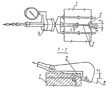 при этом hф не должна отличаться от номинального значения, принятого при испытании, более чем на ±15 %; Рi – усиление каждого из скалываний бетона выполненных на участке испытаний; n – количество испытаний; А - коэффициент пропорциональности, значение которого при использовании анкерных устройств принимается: для анкеров типа II - 30 мм: А1=0,24 см2 (бетон естественного твердения); А2=0,25 см2 (бетон, прошедший тепловую обработку); для анкеров типа III - 35 мм, соответственно А1=0,14 см2; А2=0,17см2. Прочность обжатого бетона определяют из уравнения Ri=Ri0( 6.3.10. При определении класса бетона методом скалывания ребра конструкции применяют прибор типа ГПНС-4 (рис. 6.15). Схема испытания приведена на рис. 6.16. Параметры нагружения следует принимать: а=20 мм; b=30 мм, a=18°. На участке испытания необходимо провести не менее двух сколов бетона. Толщина испытываемой конструкции должна быть не менее 50 мм. Расстояние между соседними сколами должно быть не менее 200 мм. Нагрузочный крюк должен быть установлен таким образом, чтобы величина «а» не отличалась от номинальной более чем на 1 мм. Нагрузка на испытываемую конструкцию должна нарастать плавно со скоростью не более (1±0,3) кН/с вплоть до скалывания бетона. При этом не должно происходить проскальзывания нагрузочного крюка. Результаты испытаний, при которых в месте скола обнажалась арматура, и фактическая глубина скалывания отличались от заданного более 2 мм, не учитываются. Рис. 6.15. Прибор для определения прочности бетона методом скалывания ребра 1 - испытуемая конструкция, 2 - скалываемый бетон, 3 - устройство УРС, 4 - прибор ГПНС-4 Рис. 6.16. Схема испытания бетона в конструкциях методом скалывания ребра конструкции 6.3.11. Единичное значение Ri прочности бетона на участке испытаний определяют в зависимости от напряжений сжатия бетона sб и значения Ri0. Сжимающие напряжения в бетоне sб, действующие в период испытаний, определяют расчетом конструкции с учетом действительных размеров сечений и величин нагрузок. Единичное значение Ri0 прочности бетона на участке в предположении sб=0 определяют по формуле