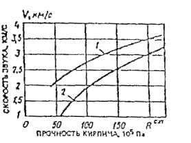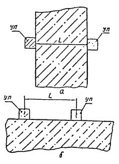 Pi - усилие каждого из скалываний, выполненных на участке испытаний. 6.3.12. При испытании методом скалывания ребра на участке испытания не должно быть трещин, сколов бетона, наплывов или раковин высотой (глубиной) более 5 мм. Участки должны располагаться в зоне наименьших напряжений, вызываемых эксплуатационной нагрузкой или усилием обжатия предварительно напряженной арматуры. Рис. 6.17. Зависимость условной прочности бетона Riy от силы скола Рi 6.4. Ультразвуковой метод определения прочности бетона6.4.1. Принцип определения прочности бетона ультразвуковым методом основан на наличии функциональной связи между скоростью распространения ультразвуковых колебаний и прочностью бетона. Ультразвуковой метод применяют для определения прочности бетона классов В7,5 - В35 (марок М100-М400) на сжатие. 6.4.2. Прочность бетона в конструкциях определяют экспериментально по установленным градуировочным зависимостям «скорости распространения ультразвука - прочность бетона V=f(R)» или «время распространения ультразвука t - прочность бетона t=f(R)». Степень точности метода зависит от тщательности построения тарировочного графика. Тарировочный график строится по данным прозвучивания и прочностных испытаний контрольных кубиков, приготовленных из бетона того же состава, по той же технологии, при том же режиме твердения, что и изделия или конструкции, подлежащие испытанию. При построении тарировочного графика следует руководствоваться указаниями ГОСТ 17624-87. 6.4.3. Для определения прочности бетона ультразвуковым методом применяются приборы: УКБ-1, УКБ-1М, УК-16П, «Бетон-22» и др. (см. табл. 6.2). 6.4.4. Ультразвуковые измерения в бетоне проводят способами сквозного или поверхностного прозвучивания. Схема испытаний бетона приведена на рис. 6.18. Рис. 6.18. Способы ультразвукового прозвучивания бетона а - схема испытания способом сквозного прозвучивания; б - то же, поверхностного прозвучивания; УП - ультразвуковые преобразователи При измерении времени распространения ультразвука способом сквозного прозвучивания ультразвуковые преобразователи устанавливают с противоположных сторон образца или конструкции. Скорость ультразвука V, м/с, вычисляют по формуле