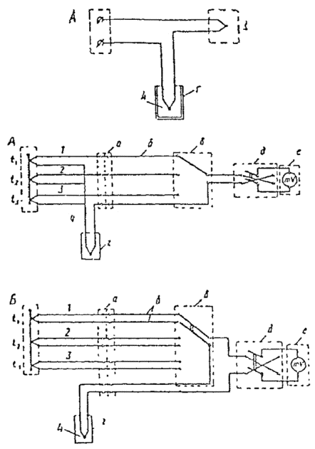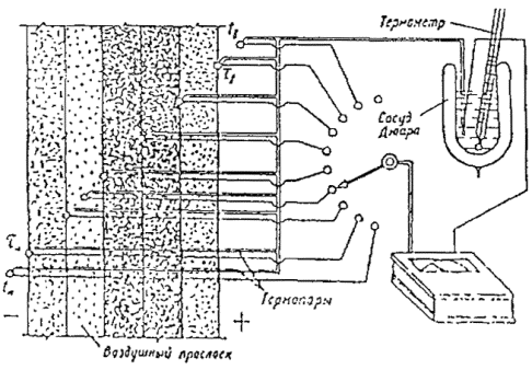 q - тепловой поток, Вт/м2; Rik - термическое сопротивление i-го слоя конструкции; li - толщина i-го слоя, м; li - коэффициент теплопроводности i-го слоя, Вт/м×°С; aв - коэффициент тепловосприятия внутренней поверхности ограждения, Вт/(м2×°C); aн- коэффициент теплоотдачи наружной поверхности ограждения, Вт/(м2×°C); Rв - сопротивление тепловосприятию внутренней поверхности ограждения, м2×°С/Вт; Rн - сопротивление теплоотдачи наружной поверхности ограждения, м2×°С/Вт; tв - температура внутренней поверхности, °С; tн - температура наружной поверхности, °С. Схема размещения датчиков термопар при измерении температур в толще многослойного ограждения показана на рис. 10.7.