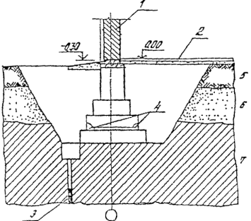 Рис. 12.1 Образец шурфа 1 - кирпичная стена; 2 - полы по грунту; 3 - скважина в шурфе; 4 – места вскрытия фундамента; 5, 6, 7 - грунтовые слои