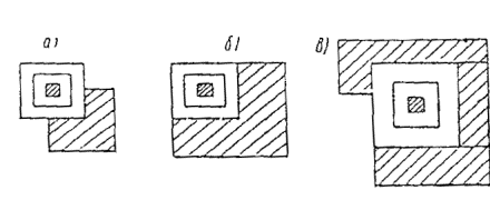Рис 12.2 Способы вскрытия столбчатых фундаментов а - «на угол»; б - «на две стороны»; в - «по периметру» 12.2.5. Ленточные фундаменты вскрываются непосредственно по отвесной грани стены. Столбчатые фундаменты должны вскрываться одним из следующих трех способов (рис. 12.2): 1. Вскрытие «на угол» - применяется при наличии симметричной геометрии фундамента в плане, при плотном размещении оборудования и невозможности его демонтажа; при отсутствии осадочных деформаций, а также при повторном обследовании; 2. Вскрытие «на две стороны» - применяется при наличии недопустимых осадочных деформаций надземной части здания на данном участке; при проектировании значительного увеличения нагрузки на грунты или при несимметричных фундаментах. 3. Вскрытие «по периметру» - применяется при аварийном состоянии участка здания, связанном с просадкой грунтов основания. Вскрытие фундаментов этим способом производится участками длиной не более 1,5 м; вскрывать фундаменты одновременно по всему периметру не допускается. 12.2.6. Результаты осмотра грунтов, параметры шурфа отмечают в журнале. Кроме того, фиксируют атмосферные условия, дату вскрытия шурфов. 12.3. Определение технического состояния фундаментов12.3.1. Из открытых шурфов производят осмотр фундаментов, определяют тип фундамента, его форму в плане, размеры, глубину заложения, определяют конструктивное решение. При обследовании свайных фундаментов в каждом шурфе замеряют их диаметр, шаг и среднее количество на 1 м фундамента. 12.3.2. При фундаментах под сборные железобетонные колонны замеряют толщину стенок стаканной части фундаментов и ее высоту. Вскрытием определяют наличие арматуры, ее диаметр, шаг и степень коррозии. 12.3.3. При монолитных фундаментах в грунтах, насыщенных водой, необходимо проверить наличие бетонной подготовки под подошвой фундамента, толщина которой должна быть не менее 100 мм. 12.3.4. При фундаментах под стальные колонны каркаса проверяют состояние подливки под стальную плиту, башмак колонны, замеряют диаметр и расстояние между анкерными болтами, действительную толщину элементов базы колонны; проверяют наличие шайб и затяжку гаек на анкерных болтах. 12.3.5. У фундаментов под колонны каркасов дополнительно проверяют геометрические размеры сечения фундаментных балок, наличие гидроизоляции, а у сборных ленточных фундаментов - перевязку блоков. При этом сравнивают материалы обследования с данными проекта. При наличии больших повреждений фундаментов назначают дополнительные покрытия. 12.3.6. При обследовании фундаментов из бутовых камней и кирпичной кладки определяют прочность камня и раствора, выявляют повреждения и дефекты в соответствии с указаниями разд. 7 настоящего Пособия. Определение прочностных характеристик бетонных и железобетонных фундаментов производят в соответствии с указаниями разд. 6 настоящего Пособия. 12.3.7. При обследовании фундаментов обязательно определение влажности материалов конструкций, наличия и состояния гидроизоляции, особенно при неглубоком залегании грунтовых вод. 12.3.8. Определение прочностных характеристик образцов материалов, отобранных из фундаментов, производят в соответствии с указаниями разд. 6 и 7 настоящего Пособия. 12.3.9. При обнаружении в конструкциях надземной части здания деформаций осадочного характера (вертикальных и наклонных трещин в кир