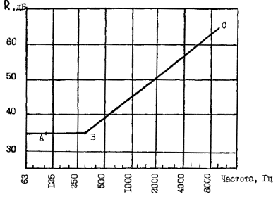 Из точки В влево проводим горизонтальный отрезок ВА, а вправо от точки В - отрезок ВС с наклоном 6 дБ на октаву до точки С с ординатой 65 дБ. Точка С соответствует частоте 10000 Гц, т.е. находится за пределами нормируемого диапазона частот. Рассчитанная частотная характеристика изоляции воздушного шума рассмотренной перегородки приведена на рис. 3.2. В нормируемом диапазоне частот она составляет: