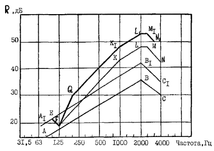 Линия EFKLIN является частотной характеристикой изоляции воздушного шума перегородкой с незаполненным воздушным промежутком. г) На частоте 1,6fp=200 Гц отмечаем точку Q с ординатой rq=25+5= 30 дБ (по табл. 3.7 поправка DR4=5 дБ) и соединяем ее с точкой F. Далее строим частотную характеристику параллельно линии FKLMN, прибавляя к ее значениям поправку DR4=5 дБ. В нормируемом диапазоне частот изоляция воздушного шума данной перегородкой составляет:
