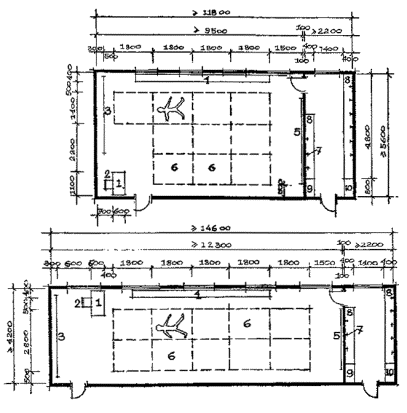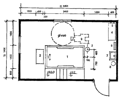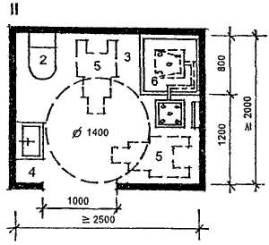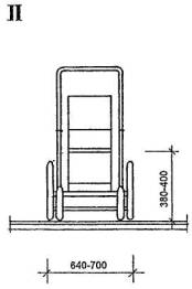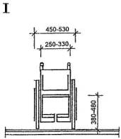 РИС. 6.35. ПРИМЕРЫ ПЛАНИРОВКИ МЕЛЬЦЕРОВСКИХ БОКСОВ НА 1 И НА 2 МЕСТА 7. ТРЕБОВАНИЯ К ПОМЕЩЕНИЯМ КУЛЬТУРНО-МАССОВОГО ОБСЛУЖИВАНИЯВ состав помещений культурно-массового обслуживания всех типов школ-интернатов для детей-инвалидов, как правило, входят актовый зал с эстрадой, фойе и вспомогательные помещения, кружковые помещения, спортивный зал, бассейн. Актовый зал предусматривается с учетом расстановки мест для обычных ходячих зрителей и для инвалидов-колясочников (Рис. 7.1). Количество мест, которые следует предусматривать для инвалидов-колясочников, определяется заданием на проектирование. Примеры планировки кружковых помещений (живописи и рисунка, музыкальных занятий) приведены в разделе 5 "Требования к помещениям учебно-профессиональной подготовки" (Рис. 5.17, 5.18). Состав кружковых комнат определяется заданием на проектирование в зависимости от профиля учреждения и местных условий. Планировочные особенности раздевальных при спортивном зале и бассейне, учитывающие функционирование инвалидов-колясочников, приведены на Рис. 7.2 (пунктиром указана рабочая зона). На Рис. 7.3 - 7.5 приведены примеры приспособлений и оборудования применяемых для облегчения входа инвалидов в бассейн.