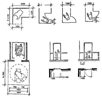 РИС. 3.7. ГАБАРИТНЫЕ СХЕМЫ ПАНДУСОВ, ПОВОРОТОВ В КОРИДОРАХ, ОТКРЫВАНИЯ ДВЕРЕЙ. ЛИФТОВЫХ ПЛОЩАДОК; ЛИФТОВЫХ ДВЕРЕЙ