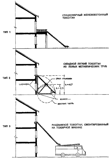 РИС. 3.12. ТИПЫ ТОБОГГАНОВ, ИСПОЛЬЗУЕМЫХ ДЛЯ ЭВАКУАЦИИ НА СЛУЧАЙ ПОЖАРА