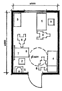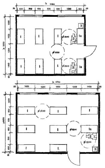 РИС. 4.9. ПЛАНИРОВОЧНАЯ СХЕМА СПАЛЬНЫХ КОМНАТ НА 3 И 4 МЕСТА С САНИТАРНЫМИ УЗЛАМИ ДЛЯ СЛЕПЫХ И СЛАБОВИДЯЩИХ ДЕТЕЙ ШКОЛЬНОГО ВОЗРАСТА 5. ТРЕБОВАНИЯ К ПОМЕЩЕНИЯМ УЧЕБНО-ПРОФЕССИОНАЛЬНОЙ ПОДГОТОВКИПомещения учебно-профессиональной подготовки в школах-интернатах являются основной базой для обеспечения главной функции этих учреждений - социальной реабилитации и адаптации детей-инвалидов. В школах-интернатах обычные учебные занятия происходят в классах, закрепленных за каждой группой, в привычном, психологически обжитом помещении, где у каждого ученика есть его собственное место. В таких классах по рекомендации психологов и педагогов (за исключением школ-интернатов для детей, больных сколиозом) предусматривается зона психологической разгрузки с кушеткой, креслом, небольшой шведской стенкой, где уставший от занятий ребенок может полежать, посидеть в кресле или размяться на шведской стенке. Кабинетная система предусмотрена только для специализированных занятий - уроков физики, химии, биологии, обучения компьютерной техники, машинописи и т.п. На Рис. 5.1 приводится пример планировки класса на 10 чел. (в том числе 2 инвалида-колясочника) с зоной психологической разгрузки для умственно отсталых детей, детей с недостатками речи и с заболеваниями опорно-двигательного аппарата. При этом для детей с заболеваниями опорно-двигательного аппарата разработан вариант в расчете на 1 место для стоячего ребенка, 1 место для ребенка, пристегнутого ремнями, и 1 лежачее место (Рис. 5.2). Требования к проектированию классов для детей, больных сколиозом, обусловлены тем, что дети занимаются лежа на кушетках (Рис. 5.3), а для глухих и слабослышащих детей тем, что дети должны быть расположены так, чтобы хорошо видеть артикуляцию педагога (Рис. 5.4). Особый подход к проектированию учебных помещений для слепых обусловлен необходимостью предусматривать для них столы больших размеров, чем для остальных детей (из-за увеличения размера книг), смотровые окна, а также отсутствием инвалидов-колясочников. С учетом этого на Рис. 5.5, 5.6 приводятся схемы планировки классов для слепых и слабовидящих детей на 8 и 10 чел. с зоной психологической разгрузки. На Рис. 5.7 - 5.11 представлены планировочные схемы специализированных кабинетов + физики (он же химии), биологии с живым уголком, компьютерного класса, классов черчения и обучения машинописи. Кабинет физики и химии может быть совмещен в одном помещении, но при этом лаборантские должны быть раздельными и запроектированы по нормативам общеобразовательных школ. Для обучения слепых и слабовидящих детей (Рис. 5.12 - 5.14) разработаны специальные планировочные схемы кабинетов физики и химии, биологии, компьютерного класса. Планировочные схемы библиотеки с читальным залом, абонементом и открытым доступом к книгам разработаны в двух вариантах: для слепых и слабовидящих детей и для детей с другими видами заболеваний (Рис. 5.15, 5.16) Библиотека, классы рисунка и музыкальных занятий (Рис. 5.17, 5.18) могут быть предусмотрены как в составе учебных помещений, так и в составе помещений культурно-массового обслуживания. Для обучения детей-инвалидов домоведению - умению подобрать продукты, изготовить из них определенные блюда, накрыть и сервировать стол, принять гостей, а также бытовым навыкам и т.п. в составе школ-интернатов предусматриваются обычная од