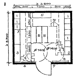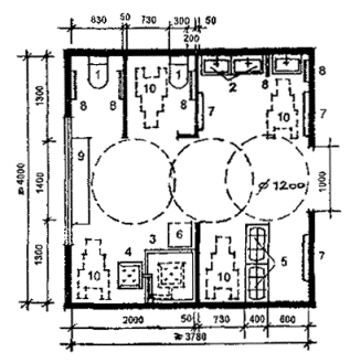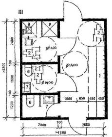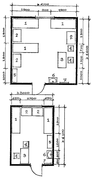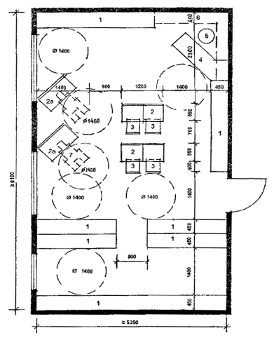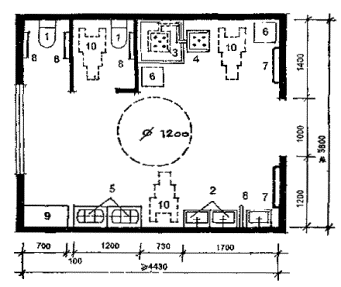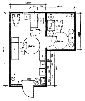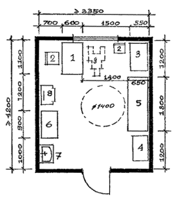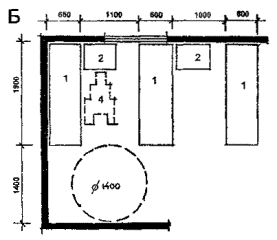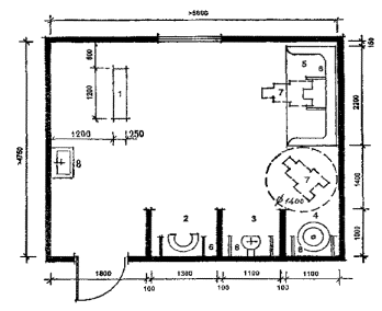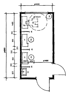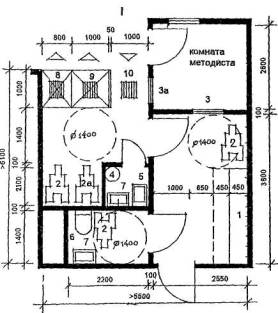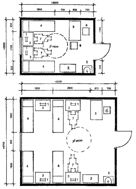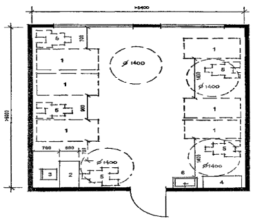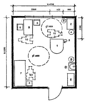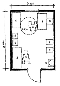 РИС. 5.28. ПРИМЕР ПЛАНИРОВКИ УНИВЕРСАЛЬНОЙ МАСТЕРСКОЙ (ДЛЯ СЛЕПЫХ И СЛАБОВИДЯЩИХ ДЕТЕЙ) 6. ТРЕБОВАНИЯ К ПОМЕЩЕНИЯМ МЕДИЦИНСКОГО ОБСЛУЖИВАНИЯПомещения медицинского обслуживания предназначены как для текущей врачебной помощи, так и для медицинской реабилитации инвалидов. Примеры планировки даны для специфических помещений медицинского обслуживания инвалидов. Остальные помещения проектируются по действующим нормативам для лечебно-профилактических учреждений. Габариты мебели и оборудования приводятся ориентировочно в связи с большим разнообразием типов применяемых в практике приборов, устройств и т.п. аналогичного названия. Разработка планировочных схем должна учитывать: - технологические требования к размещению оборудования (расстояния между приборами, между приборами и стенами и т.п.); -необходимость обслуживания инвалидов-колясочников (подъезды, проезды, повороты); - специфику обслуживания инвалидов с различными видами заболеваний. Часть помещений медицинского обслуживания предназначается для всех типов школ-интернатов. Это - кабинеты врачей, процедурные, кабинеты консультативного приема, психоневролога, логопеда, гинеколога, стоматологический кабинет, ингаляторий (Рис. 6.1 - 6.17). Кроме них имеются специфические лечебные кабинеты для обслуживания детей с определенными видами заболеваний. К ним относятся кабинеты тифлопедогогов в учреждениях для слепых и слабовидящих; кабинеты логопедов в учреждениях для умственно-отсталых детей, детей с недостатками речи и больных сколиозом; кабинеты индивидуальной работы для глухих и слабослышащих детей (Рис. 6.18). Характерно, что часть таких кабинетов приближена к инвалидам, т.е. Расположена в составе учебно-жилых ячеек. В учреждениях для глухих детей и детей с недостатками речи все медицинские кабинеты специфического обслуживания включаются в состав учебно-жилых ячеек, а в состав блока медицинского обслуживания входят только кабинеты, общие для всех типов заболеваний. Особую специфику имеет лечебно-восстановительное лечение детей с заболеваниями опорно-двигательного аппарата (Рис. 6.19 - 6.25), а также детей, больных сколиозом (Рис. 6.26 - 6.27). Кроме того, для детей, больных сколиозом, обходимы помещения специального ортопедического обслуживания, представляющие собой группу особым образом функционально связанных помещений (Рис. 6.28). Для таких специфических помещений, как слепочная, шорная, корсетно-слесарная разработаны примеры планировочных решений (Рис. 6.29 - 6.31). Расширенный блок специальных кабинетов составляют помещения медицинского обслуживания учреждений для слепых и слабовидящих детей. Это кабинет офтальмолога длиной не менее 25 м, кабинет развития остаточного зрения и др. (Рис. 6.32 - 6.34). Планировочные схемы всех медицинских кабинетов, за исключением кабинетов, предназначенных только для слепых и слабовидящих детей, разработаны с учетом обслуживания инвалидов-колясочников. При этом для кабинетов обслуживающих только дошкольников, необходимые размеры поворотного круга для инвалидов-колясочников приняты - 1,2 м, для кабинетов, которые предназначены для всех возрастов детей - 1,4 м. В том случае, когда общие для всех типов учреждений планировочные схемы медицинских кабинетов разработаны в расчете на инвалидов-колясочников, эти же планировки могут быть приняты и для учрежд