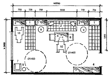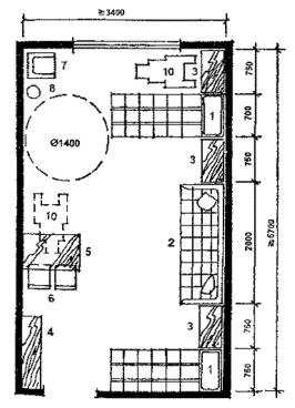 РИС. 5.19. ПЛАНИРОВОЧНАЯ СХЕМА КАБИНЕТА СОЦИАЛЬНО-БЫТОВОЙ АДАПТАЦИИ, КОМНАТА ДЛЯ ПРИЕМА ГОСТЕЙ НА 11 И 21 ПОСАДОЧНОЕ МЕСТО
