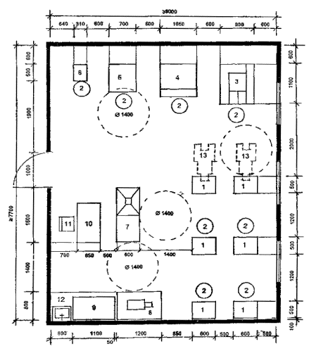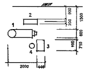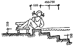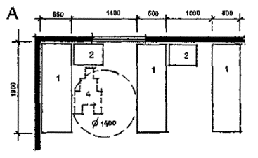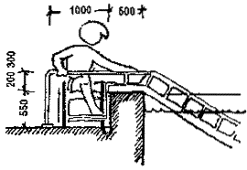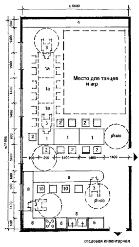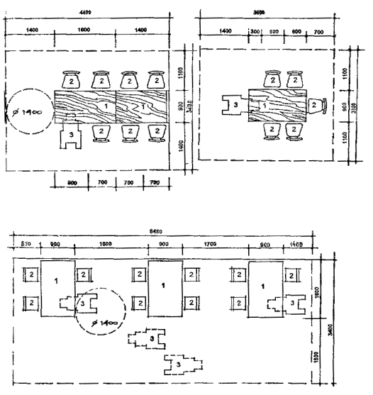2 - Сидячий подъемник РИС. 7.5 ПРИМЕРЫ ПРИСПОСОБЛЕНИЙ, ИСПОЛЬЗУЕМЫХ ДЛЯ ИНВАЛИДОВ В ПЛАВАТЕЛЬНЫХ БАССЕЙНАХ 8. ТРЕБОВАНИЯ К ПОМЕЩЕНИЯМ ПИТАНИЯВ состав помещений питания входят обеденные залы и производственные помещения кухни. Обеденные залы могут размещаться, как в составе помещений проживания, куда пища доставляется в бачках или термосах, так и непосредственно при блоке кухонных помещений. Обеденные залы для школьников, за исключением больных сколиозом, слепых и слабовидящих, независимо от того, где они располагаются, в составе жилых помещений или при кухне, проектируются с учетом обслуживания инвалидов-колясочников на основе принципов организации обеденных мест приведенных на Рис. 8.1. Организация обеденных мест в столовых для детей, больных сколиозом, а также слепых и слабовидящих, принимается в соответствии со схемами, приведенными на Рис. 8.2. Для дошкольников обеденные места располагаются на площади групповой комнаты и проектируются в соответствии с планировочными схемами, приведенными в разделе 4 "Требования к помещениям проживания" (Рис. 4.2, 4.3). Производственные помещения кухни проектируются в соответствии с требованиями норм по проектированию предприятий общественного питания.