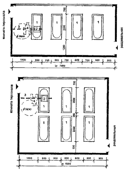 РИС.6.16. ПЛАНИРОВОЧНЫЕ СХЕМЫ ВАННЫХ ЗАЛОВ НА 4 И 6 ВАНН