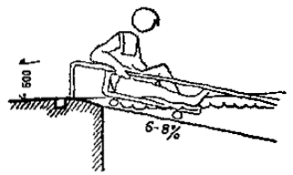 РИС. 3.13. СХЕМЫ ТОБОГГАНОВ 4. ТРЕБОВАНИЯ К ПОМЕЩЕНИЯМ ПРОЖИВАНИЯСогласно МГСН 4.02-94 "Дома-интернаты для детей-инвалидов" предусматривается два основных планировочных типа помещений проживания: 1 - по типу дошкольных учреждений, когда раздевальная, групповая, спальная и туалетная образуют единый блок помещений, 2 -по типу коридорной системы, когда спальные с другими помещениями жилой ячейки связаны через коридор. Главный принцип организации проживания в школах-интернатах - отход от укоренившейся казарменной системы и максимальное приближение жилой ячейки в целом и отдельных ее помещений к организации проживания по семейному принципу независимо от планировочного типа помещений проживания. При этом должны быть созданы условия для наиболее полного вовлечения во все процессы, происходящие в жилой ячейке (прием пищи, игры, отдых, учеба, развлечения) персонала - учителей, воспитателей, нянь. Жилые помещения, проектируемые по типу детского сада, как показала практика, также удобны и для младших школьников. В предлагаемых на Рис. 4.1 - 4.3 планировочных схемах учтены потребности инвалидов-колясочников: предусмотрены необходимые габариты проходов, возможности разворотов и др. При этом размер разворотного круга принимается для детей-дошкольников - 1,2 м. В спальных помещениях, рассчитанных на группу дошкольников, следует соблюдать необходимые санитарно-гигиенические требования - отказ от спаренных кроватей, возможность проходов и разворотов для инвалидов-колясочников т.п. (Рис. 4.1). Групповая комната - помещение многофункционального назначения, предназначенная для приема пищи, учебы, игр. Для того, чтобы помещение могло работать во всех режимах в отечественной практике традиционно используется мебель, пригодная для всех вышеприведенных функций. Это легкие передвижные столики, служащие для приема пищи, учебных занятий, настольных игр. Несмотря на то, что обучение дошкольников занимает в течение дня всего 1-2 часа, требование к организации процесса обучения является определяющим в планировке этого помещения. Задача его рационального проектирования осложняется еще и тем, что групповая комната является связующим звеном между раздевальной, спальной, туалетной и буфетной комнатами. На Рис. 4.2, 4.3 приводятся возможные варианты планировки групповой комнаты, разработанные с учетом приведенных выше положений. При этом все двери, ведущие в групповую сосредоточены в одной зоне, которая на время проведения учебных занятий служит местом прохода и возможного разворота инвалидов-колясочников, а на время игр служит местом для подвижных игр. Возможность обслуживания инвалидов-колясочников предопределяет особенности организации (планировочной) санитарных узлов для дошкольников. Необходимость предусматривать проходы, развороты для колясок, возможность подхода колясочников к санитарным приборам, устройства поворотного кресла при душевой - главные условия проектирования туалетных для дошкольных групп (Рис. 4.4). Соблюдение требований прохода и разворота инвалидных колясок должны учитываться при проектировании раздевальных (Рис. 4.5). При проектировании помещений проживания для слепых и слабовидящих дошкольников, в условиях отсутствия инвалидов-колясочников, проходы должны быть рассчитаны 90 см в расчете на одностороннее движение и 120 см в расч