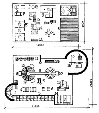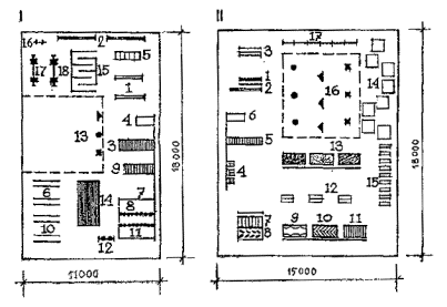 РИС. 1. ЛЕЧЕБНО-ИГРОВЫЕ ПЛОЩАДКИ ДЛЯ ДЕТЕЙ С ЗАБОЛЕВАНИЯМИ ОПОРНО-ДВИГАТЕЛЬНОГО АППАРАТА (ПО РЕКОМЕНДАЦИЯМ ЦНИИЭП УЧЕБНЫХ ЗДАНИЙ): I. ГИМНАСТИЧЕСКАЯ ПЛОЩАДКА: 1 - бревно на грунте; 2 - бревно на стойках; 3 - доска на грунте; 4 - скамья; 5 - наклонная лестница; 6 - наклонная доска; 7 - брусья; 8 - перекладина; 9 - рукоход; 10 - шесты; 11 - кольца; 12 - ориентиры на грунте для построения детей; 13 - шведские стенки; 14 - вертикальные гимнастические лестницы; 15 - доска с планочками II. ЛЕЧЕБНО-ГИМНАСТИЧЕСКАЯ ПЛОЩАДКА-1 - вертикальные гимнастические лестницы; 2 - дорожка для дифференцирования движений; 3 - шведские стенки; 4 – скамья; 5 - наклонная лестница; 6 - наклонная доска; 7 - циклотренажер; 8 - качающаяся плоскость; 9 - батут; 10 - различные виды подъемов; 11 - ориентиры на грунте для построения детей; 12 - дорожки из различных покрытий; 13 - валиковые дорожки; 14 - волнистая доска; 15-доска "елочка"; 16 - спедоступ; 17 - дорожка с разделителем; 18 - велотренажер