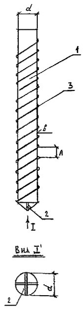 Рис. 2.1. Схема бурозавинчивающейся сваи 2.1.4. Крестообразный наконечник изготавливается ив двух металлических заостренных пластин толщиной 8 мм, сваренных в виде креста между собой. В зависимости от технологии, устройства бурозавинчивающихся свай, наконечник может быть съемным и оставляемым в грунте после погружения сваи; до проектной отметки или же глухим, приваренным к круглой пластине толщиной не менее 6 мм, закрывающей нижний конец сваи. Угол заострения наконечника - 60°. 2.1.5. Спиральная навивка представляет собой непрерывный металлический стержень треугольного, квадратного или круглого сечения (например, арматуру) шириной в = (0,04 ¸ 0,06)d, приваренный к металлической трубе с шагом а = (0,5 ¸ 1,0))d, где d - наружный диаметр трубы. 2.1.6. При использовании съемного наконечника стенки бурозавинчивающейся сваи, выполняют роль инвентарных обсадных труб и технология устройства свай аналогична технологии, применяемой при изготовлении буронабивных свай типа ВСИ. 2.1.7. Основная область применения фундаментных конструкций из бурозавинчивающихся свай - строительство и реконструкция зданий и сооружений, вблизи существующих зданий и сооружений, когда погружение забивных и вибропогружаемых свай может вызвать недопустимые динамические воздействия на близлежащие здания и сооружения и их основания, а устройство буронабивных свай - недопустимую разгрузку и разрыхление грунтов при проходке скважин. 2.2. Конструкции из щебеночных свай2.2.1. Щебеночные сваи применяются для усиления оснований существующих и вновь возводимых фундаментов и изготавливаются в грунтах, устойчиво держащих стенки скважин, по патенту РФ "Способ усиления оснований симметрично нагруженных фундаментов" (патент № 2026926). 2.2.2. Фундаментная конструкция с использованием щебеночных свай создается путем армирования грунтов основания наклонными грунтощебеночными столбами (рис. 2.2). 2.2.3. Такие столбы изготавливаются поэтапно. На каждом этапе сначала проходится участок скважины (1) с помощью пневмопробойника (2). Затем этот участок заполняется щебнем или гравием (3) и засыпанная порция материала втрамбовывается в стенки скважины пневмопробойником с формированием участка щебеночной сваи (4) диаметром D.