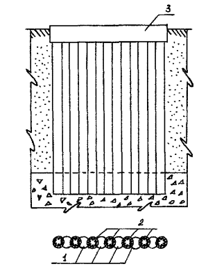 Рис.2.2. Схема изготовления щебеночной сваи. 1-скважина, 2-пневмопробойник, 3-щебень (гравий), 4-участок щебеночной сваи, 5-готовая щебеночная свая, 6-внутренняя полость сваи. После окончания формирования сваи (5) внутренняя ее полость (6) диаметром d, соответствующим диаметру пневмопробойника, заполняется щебнем. 2.2.4. Длина щебеночных свай достигает 10 м, а наружный диаметр - 300мм. 2.2.5. Основная область применения фундаментных конструкций из щебеночных свай - реконструкция и усиление зданий и сооружений различного назначения. 2.3. Комбинированные свайно-плитные фундаменты (КСП)2.3.1. Комбинированные свайно-плитные фундаменты (КСП) применяются для многоэтажных тяжелых зданий, строительство которых намечается на площадках, где с поверхности залегают грунты средней прочности и плитный фундамент, даже при достаточной несущей способности грунта, не проходит по деформациям. 2.3.2. Для КСП фундаментов используется буронабивные сваи диаметром 800-1200 мм и длиной до размера, ширины здания, сооружаемые по технологии, предусмотренной п. 2.5а) СНиП 2.02.03-85, либо забивные железобетонные сваи, сплошные, квадратного сечения с поперечным армированием ствола размерами 35´35 или 40´40 см по ГОСТ 19804.1-79*. 2.3.3. По грунтовым условиям и конструкции фундамента сваи в этом типе фундаментов должны работать как висячие, и поэтому они располагаются под фундаментной плитой по сетке с расстояниями между осями свай 5-7 диаметров (поперечных размеров). 2.4. Конструкции из буронабивных свай2.4.1. Для строительства в г. Москве новым эффективным типом фундаментных конструкций следует считать фундаменты буронабивных свай, устраиваемые в соответствии с требованиями СНиП 2.02.03-85 буровыми станками с инвентарными обсадными трубами (типа БСИ) и применяемые при возведении гражданских зданий повышенной этажности и крупных промышленных объектов. Вместе с тем при эффективности устройства уширения в нижней части свай могут быть использованы буронабивные сваи, изготавливаемые с закреплением стенок скважин неизвлекаемыми обсадными трубами (типа БСВо), а при устройстве свай в устойчивых глинистых грунтах - без закрепления стенок скважин (типа БСС). 2.4.2. Диаметр буронабивных свай составляет от 600 до 1500 мм, а длина - до 40 м. 2.4.3. Новой модификацией фундаментов из буронабивных свай являются конструкции буросекущихся свай (рис. 2.3), используемые в качестве ленточных фундаментов либо комбинированных (несущих и ограждающих) фундаментных конструкций, в частности, при устройстве фундаментных конструкций заглубленных сооружений при освоении подземного пространства в г. Москве. 2.4.4. Диаметр буросекущихся свай d составляет от 600 до 800 мм, а длина - до 40 м. Расстояние между центрами свай составляет (0,8÷0,9)d. 2.5. Конструкции из буроинъекционных свай2.5.1. При реконструкции и усилении зданий различного назначения, а также при новом строительстве в г. Москве эффективными фундаментными конструкциями являются конструкции с использованием буроинъекционных свай, устраиваемых с учетом требований СНиП 2.02.03-85 и "Рекомендаций по применению буроинъекционных свай", НИИОСП, М., 1997. 2.5.2. При использовании буроинъекционных свай для: усиления фундаментов они, как правило, устраиваются наклонными в виде козловой конструкции. При применении буроинъекционных свай в новом строительстве они устраиваются вертикально. 2.5.3. Диаметр бур