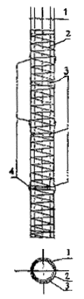 Рис. 8.1. Объемный арматурный каркас буронабивных, буросекущих и буроинъекционных свай 1-арматурный стержень; 2-хомуты; 3-трубчатые кольца; 4-фиксаторы.