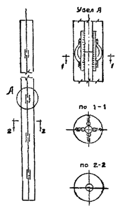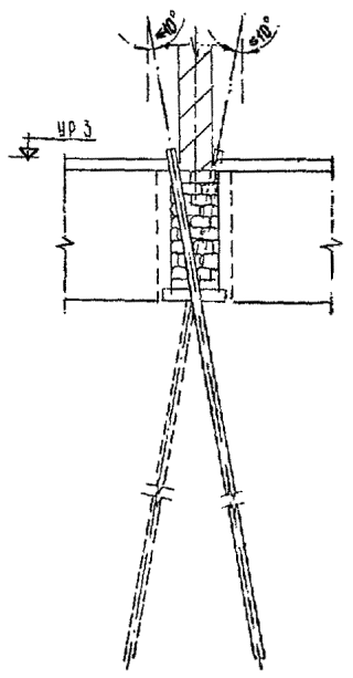 Рис. 8.2. Возможный вариант армирования буроинъекционных свай, воспринимающих нагрузку до 200 кН 8.13. Расстояние между буронабивными сваями должно быть не менее 1 м в свету, а расстояние между буроинъекционными сваями в осях - не менее трех диаметров их поперечного сечения. 8.14. Угол наклона оси буроинъекционных свай к вертикали при козловом их расположении (рис. 8.4) рекомендуется назначать не более 10 градусов. 8.15. Нижние концы свай-стоек должны заделываться в скальный невыветрелый грунт (без слабых прослоек) не менее чем на 0,5 м и одновременно не менее чем на 30 диаметров их арматуры. 8.16. При проектировании фундаментных конструкций из забивных свай определение размеров свай и их размещение в плане должны осуществляться в соответствии с рекомендациями п.п. 8.11 и 8.12 настоящего раздела. При этом независимо от конструкции фундамента и расположения свай в плане расстояния между их осями не должны быть менее Зd, где d-сторона сечения сваи или ее диаметр. 8.17. При зданиях с несущими стенами применяются, как правило, ленточные ростверки. Ширина ростверков зависит от количества свай в поперечном сечении и от ширины несущей стены. Величина свеса ростверка от грани свай должна приниматься с учетом допускаемых отклонений свай в плане (в соответствии с разделом 11 настоящих рекомендаций). Высота ростверка определяется расчетом в соответствии с требованиями СНиП 2.02.05-87. Ростверк рассчитывается как железобетонная многопролетная балка. Армирование ростверка производится пространственными арматурными каркасами, как правило, из арматуры класса AIII. Для ростверка применяют, как правило, бетон класса по прочности В15, В20. Ростверк укладывается по бетонной подготовке класса В7.5. 8.18. При зданиях со сборным железобетонным каркасом применяются ростверки стаканного типа, состоящие из плитной части и подколонника-стаканной части. Величина свеса ростверка от грани свай должна приниматься с учетом допускаемых отклонений свай в плане (в соответствии с разделом 11 настоящих рекомендаций). Размеры ростверков в плане должны приниматься в плане кратными 30 см, а по высоте -15 см. Конструктивная высота ростверка назначается на 40 см больше глубины стакана. Ростверк рассчитывается в соответствии с требованиями СНиП 2.02.05-87. Ростверк рассчитывается на изгиб (плитная часть, стаканная часть) и на продавливание (продавливание колонны и угловой сваи). Армирование ростверка производится плоскими сетками (плитная часть) и пространственными каркасами (стенки стакана), как правило, из арматуры класса AIII. Для ростверка применяют, как правило, бетон класса по прочности В15, В20. Ростверк укладывается на бетонную подготовку класса В7.5.