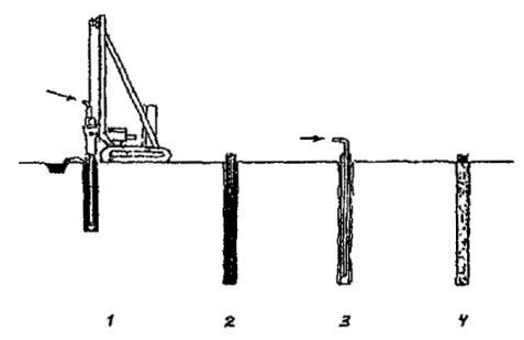 Рис.10.3. Технологическая схема устройства буроинъекционных свай с использованием шнекового бурения: 1. Бурение скважины без выемки грунта 2. Бетонирование сваи через буровой став 3. Установка армокаркаса 4. Готовая буроинъекционная свая