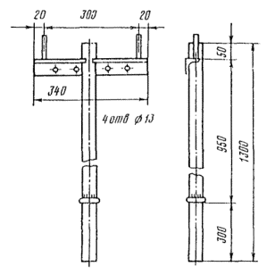 1.2.2. На прямолинейных участках линии при напряжении в цепи до 120 В включительно и одинаковых длинах пролетов допускается установка стоек типа PCI длиной 1300 мм без оттяжек. 1.2.3. Стойки типа PCIII укрепляют двумя ярусами оттяжек. Нижние концы основных (верхних) оттяжек укрепляются при помощи серьги и двух винтовых стяжек (см. рис. 1.5). На линиях типов О и Н оттяжки для стоек типа PCIII изготовляются из одной стальной оцинкованной проволоки диаметром 5 мм, на линиях типов У и ОУ - из двух стальных проволок диаметром 5 мм. Дополнительные оттяжки крепятся к стволу стойки над верхней траверсой; крепление дополнительной оттяжки к стропильному болту производится через винтовые стяжки и серьгу (см. рис. 1.5) или через одну сдвоенную винтовую стяжку. Отверстия в стойке для ввода проводов в здание должны быть плотно закрыты во избежание попадания влаги внутрь стойки. 1.2.4. Стойка типа PCIII должна быть оборудована карманами для ступенек и съемными ступеньками (рис. 1.25 и 1.26). Карманы приваривают по две штуки с двух сторон трубы. Рис. 1.25. Карман для съемной ступеньки. Рис. 1.26. Съемная ступенька. 1.3. Типы и размеры станционных стоек1.3.1. Для вывода проводов из помещения станции применяют выводные станционные стойки. Эти стойки применяют также и в тех случаях, когда при столбовой линии по условиям габарита невозможно установить выводной кронштейн. 1.3.2. Выводные станционные стойки могут быть двусторонние, трехсторонние или четырехсторонние (рис. 1.27 - 1.31). Рис. 1.27. Восьмипарная станционная двусторонняя стойка для вывода цепей напряжением до 240 В включительно (общий вид).