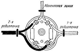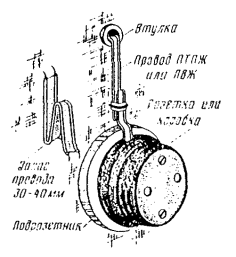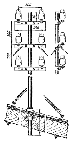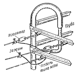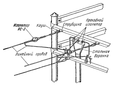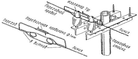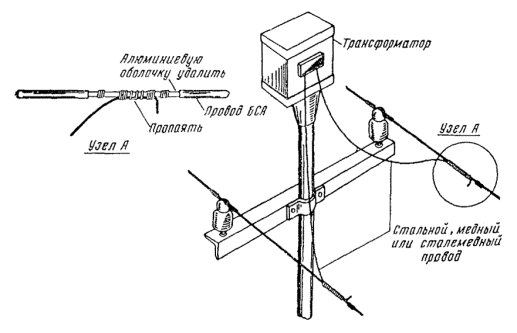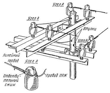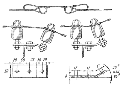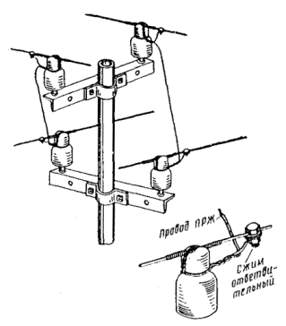 1.10.8. Провода PC на стойках можно подвешивать над проводами линий электропередачи (ВЛ) с напряжением не более 380/220 В. В пролете пересечения применяются провода марки ПРСП или ПРСВ диаметром 3 или 4 мм. На стойках, ограничивающих пролет пересечения, линейные провода должны иметь двойное крепление. 1.10.9. Переходные стойки должны иметь диаметр трубы не менее 60 мм. 1.10.10. Соединение и крепление проводов PC на переходных стойках при пересечении контактных сетей должны производиться по указаниям рис. 1.55. При пересечении линий электропередачи и линии PC крепление проводов производится так, как показано на рис. 1.53. Рис. 1.55. Соединение каната с линейным проводом на стойках при пересечении контактных сетей: а) крепление проводов на трех изоляторах; б) крепление проводов на двух изоляторах. 1.10.11. Нижние провода линий PC, пересекающие контактные сети (с учетом наихудших метеорологических условий для данной местности при гололеде, изморози или максимальной температуре) должны располагаться в пролете пересечения на высоте: - не менее 2 м над верхними проводами контактной сети эл. ж. д. постоянного тока; - не менее 8 м от головки рельс (трамвая) и не менее 9 м от уровня полотна дорожного покрытия (троллейбуса). 1.10.12. Устройство и ремонт проводов линий PC при воздушном пересечении с контактными сетями наземного электротранспорта должны производиться в соответствии с действующими правилами техники безопасности при производстве работ на контактных сетях эл. ж. д. постоянного тока, трамваев и троллейбусов. Указанные работы проводятся при отключенной и заземленной на месте производства работ контактной сети и при обязательном присутствии представителя службы дистанции (района) контактной сети. В исключительных случаях, по согласованию между заинтересованными организациями, допускается производить работы на линиях PC, пересекающих контактную сеть трамваев или троллейбусов, без снятия напряжения в контактной сети. Устройство и ремонт подземного кабельного пересечения линиями PC контактных сетей наземного электротранспорта можно производить без отключения напряжения в контактной сети. 1.10.13. В пролете подземного пересечения линий PC с проводами контактных сетей наземного электротранспорта могут быть применены следующие кабели: - для PC II класса - типов ПРППМ, МРМП, МРМ; - для PC I класса - типов МРМП, МРМ, МРМПЭ, МРМПЭБ, СРВ и КСНБ. При прокладке в канализации или в трубах городских линий при всех напряжениях линии PC применяют кабели типов МРМ, МРМП, МРМПЭ и МРМПЭБ. При многопрограммном вещании и напряжении до 360 В рекомендуется применять кабели типов МРМ, МРМП, МРМПЭ, МРМПЭБ. 1.11. Фидерные отводы и выводы из помещений станций или подстанций радиотрансляционных узлов1.11.1. Если радиофицируемый пункт находится в стороне от фидерной линии, то прокладывается к нему специальная линия, которую называют фидерным отводом. Устройство фидерного отвода на стоечных линиях изображено на рис. 1.56. Рис. 1.56. Устройство ответвления проводов от фидера. 1.11.2. Понижающие трансформаторы могут устанавливаться на стойках, в чердачном помещении, на лестничной клетке и в помещении радиофицируемого дома. 1.11.3. В качестве выводных проводов для линий II класса применяют провода марок ПРЖ, ППЖ, ПТПЖ, ПВЖ, ПРППМ или ПРВПМ с сечением жилы не менее 1,0 мм2, прокладываемые в шлангах. В трубу стойки пров