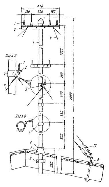 Примечания: 1. Для линий типов О и Н допускается изготовлять стволы стоек тепа PCI длиной 1300 мм из труб с наружным диаметром 33,5 мм и толщиной стенки 2,8 мм или из труб с наружным диаметром 32 мм и толщиной стенки 3,0 мм. 2. Тип линии (О, Н, У м ОУ) определяется по ч. I «Правил строительства и ремонта воздушных линий связи и радиотрансляционных сетей» (М., «Связь», 1975). 1.1.4. Стойки типа PCI (рис. 1.1 - 1.3) применяют при напряжении цепи PC до 240 В включительно, габарите линии 0,8 мм и при размещении на каждой траверсе одной цепи. Траверсу к стойке со стволом длиной 1300 мм допускается крепить при помощи электросварки (рис. 1.2). Рис. 1.1. Стойка типа РСI (габарит 0,8 м) с одной съемной траверсой: 1 - ствол стойки; 2 - траверса съемная для стоек PCI; 3 - штырь; 4 - оттяжка; 5 - хомут траверсы; 6 - опорное кольцо; 7 - копыто; 8 - болт стропильный; 9 - хомут для крепления стойки; 10 - винтовая стяжка дли натяжения оттяжек. Рис. 1.2. Стойка типа PCI (габарит 0,8 м) с приваренной траверсой. 1.1.5. Стойки типа РСII (рис. 1.4) применяют в тех случаях, когда цепи одного или двух направлений объединяют на одной линии, а на каждой траверсе размещают две цепи. Рис. 1.3. Стойка типа PCI (габарит 0,8 м) для трех траверс. Рис. 1.4. Стойка типа РСII (габарит 0,8 м), применяемая при объединении линий: 1 - ствол стойки; 2 - траверса съемная для стоек РСII; 3 - штырь; 4 - оттяжка; 5 - хомут траверсы; 6 - опорное кольцо; 7 - копыто; 8 - болт стропильный; 9 - хомут для крепления стойки; 10 - винтовая стяжка для натяжения оттяжек. 1.1.6. Стойки типа PCIII (рис. 1.5) применяют для подвески цепей PC с напряжением выше 240 В до 960 В включительно, при габарите линии 2,5 м, а также для совместной подвески фидерных цепей I и II классов или если длина стоек типа PCI недостаточная и не обеспечивает необходимого габарита линии. На траверсах стоек типа PCIII во всех случаях размещается одна цепь PC с двойным креплением проводов. Подвеска на стоечных линиях цепей с напряжением выше 960 В запрещается. 1.1.7. Стойки с длиной ствола от 1600 мм до 4200 мм изготовляются со съемными траверсами. Хомуты для крепления съемных траверс и карманы для съемных ступенек привариваются к трубе ствола стойки. На стойках типа PCIII (рис. 1.5) на расстоянии 500 и 1000 мм от нижней траверсы привариваются два хомута для постоянных ступенек. Хомуты и карманы для ступенек располагаются в плоскости, перпендикулярной плоскости расположения хомутов траверс. По требованию заказчика допускается изготовление стоек с неприваренными хомутами к стволу стойки. Рис. 1.5. Стойка типа PCIII (габарит 2,5 м): 1 - ствол стойки; 2 - траверса съемная для стоек PCIII; 3 - штырь; 4 - оттяжка; 5 - хомут траверсы; 6 - опорное кольцо; 7 - копыто; 8 - болт стропильный; 9 - хомут для крепления стойки; 10 - винтовая стяжка для натяжения оттяжек; 11 - карман для съемных ступенек. 1.1.8. На стоечных линиях применяются следующие траверсы: - съемные для стоек типа PCI (рис. 1.6); - привариваемые для стоек типа PCI (рис. 1.7); - съемные для стоек типа РСII (рис. 1.8); - съемные для стоек типа PCIII (рис. 1.9). Для устройства ответвлений радиосети на промежуточной стойке применяют траверсу одноштырную (рис. 1.10). Для крепления стойки к стропильной балке, а траверс и ступенек к стойке, применяют хомуты (рис. 1.11 и табл. 1.2). Рис. 1.6. Траверса съемная для стоек типа PCI. Рис. 1.7. Траверса, привариваемая для стоек типа PCI.