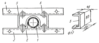 Рис. 1.36. Установка стойки на крыше с черепичной кровлей. Рис. 1.37. Установка стойки на крыше с кровлей из волнистой асбофанеры. Под копыто переходных стоек, а также стоек, габарит которых 2,5 м, необходимо подкладывать стальную прокладку (подкопытник) - стальной лист толщиной 5 мм размерами 250×250 мм. На зданиях с железобетонными совмещенными кровлями, т.е. на таких крышах, где кровля является одновременно и потолком квартиры верхнего этажа, стойки устанавливают в специальные, установленные на крышах при строительстве здания гильзы из стальной трубы или как на рис. 1.38 и 1.39. Рис. 1.38. Установка стоек на железобетонных прокатных кровлях: 1 - ствол стойки; 2 - опорное кольцо; 3 - копыто; 4 - болты M16×150 с гайками; 5 - стальная пластина Ст3 (2 шт.); 6 - кровля железобетонная; 7 - угловая равнобоковая сталь (верхняя) 50×50×5 (4 шт.); 8 - то же, нижняя 50×50×5 (4 шт.). Рис. 1.39. Установка стоек на кровлях с железобетонными балками: 1 - ствол стойки; 2 - опорное кольцо; 3 - копыто; 4 - болты 16×400 с гайками; 5 - стальная пластина Ст3 (2 шт.); 6 - балка железобетонная; 7 - угловая равнобоковая сталь (верхняя) 50×50×5 (4 шт.); 8 - то же, нижняя 50×50×5 (4 шт.). При отсутствии на зданиях с совмещенной кровлей специальных гильз и якорей вопрос о возможности и способе установки стоек PC на таких кровлях решается в местном архитектурно-строительном управлении. Если имеется машинное отделение над шахтой, стойку устанавливают на стене здания. 1.5.6. После того как стоечная труба, опущенная в отверстие копыта, достигнет кольца, проводят разметку отверстий для крепления стойки хомутом. Стойка прочно закрепляется одним хомутом к деревянной стропильной балке при помощи болтов. Стойки типа PCIII крепятся двумя хомутами. Для предотвращения смятия древесины стропильной балки и выравнивания неровностей поверхности опорного кирпичного столбика между стволом стойки и балкой (столбиком) под хомутом устанавливается подхомутник из стальной полосы марки Ст3 размером 160×40×4 мм. 1.5.7. При подвеске проводов на стойках, установленных на крышах зданий, наблюдается во время ветра сильный гул (шум), происходящий от вибрации проводов; он проникает во внутренние жилые помещения и производит крайне неприятное ощущение. Для устранения этого шума необходимо: 1) крепление проводов на изоляторах производить с применением специальных вязок с рессорами или хомутиками, как это указано в Правилах, части I на рис. 6.74 - 6.76 и 7.6 (М., «Связь», 1975); 2) на каждый провод вблизи изолятора надевать свинцовый цилиндр (имеющий вдоль разрез, равный диаметру провода) длиной 100 мм и диаметром 10 мм, в разрез закладывается провод, а затем цилиндр сплющивается; 3) вблизи стойки на каждом проводе (с обеих сторон стойки) устанавливать резиновые демпферы (глушители) с креплением их к проводу металлическими манжетами. Демпфер состоит из двух резиновых полос длиной 400 - 500 мм, толщиной 20 мм с желобом для провода. На провод надевают резину, а затем манжету, изготовленную из кровельной стали, и закрепляют в двух-трех местах перевязочной проволокой; 4) натяжение оттяжек уменьшать возможно больше с помощью винтовых стяжек, а под копыто и хомут, крепящий стойку к стропильной балке, подкладывать прокладки из плотной резины; 5) уменьшать тяжение в проводах (оно должно быть меньше величин, указанных в таблицах, на 10 - 20 кг); 6) в пролете между зданиями и между стойками, установленными на з