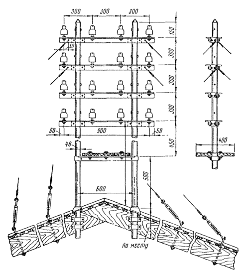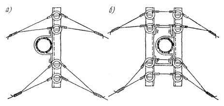 Рис. 1.15. Подкопытник: (размер d находится по табл. 1.4). Рис. 1.16. Ступенька: 1) полоса стальная 450×50×5; 2) упоры Æ 16 мм. Рис. 1.17. Стяжка винтовая для стоек типов РСI и РСII. Рис. 1.18. Стяжка винтовая для стоек типа PCIII: 1 - винт (М16) с крюком, длина резьбы 250 мм; 2 - болт с ушком Æ 16 мм без резьбы с заглушкой; 3 - заглушка на болте гайка М16; 4 - гайка круглая Æ 35×20 с отверстием Æ 17 мм; 5 - то же, с резьбой М16; 6 - круглый стержень Æ 14 мм; 7 - шайба; 8 - контргайка М16. Рис. 1.19. Стропильный болт для крепления оттяжки к балке: d = 12 мм, D = 30 мм (для стоек PCI и PCII); d = 16 мм, D = 40 мм (для стоек PCIII). Рис. 1.20. Серьга. Рис. 1.21. Болт для крепления трубы стойки к стропильной балке. 1.1.10. На стойках типов PCI и РСII устанавливают штыри типа ШТ-16С и изоляторы типа ТФ-16, а на стойках тина PCIII - штыри ШТ-20С и изоляторы типа ТФ-20. 1.1.11. Стойка должна иметь антикоррозионное покрытие (ГОСТ 5631-51). 1.1.12. На угловых стойках при внутреннем угле поворота линии 165° и менее и при диаметре проводов более 3,0 мм, а также на оконечных и переходных стойках устанавливаются дополнительные траверсы, укрепляемые к основным траверсам с помощью двух кронштейнов из швеллера № 8 или № 10 (рис. 1.22). Двойное крепление проводов выполняют так, как показано на рис. 1.23. Рис. 1.22. Крепление дополнительной траверсы: 1 - ствол стойки; 2 - хомут; 3 - основная траверса; 4 - дополнительная траверса; 5 - кронштейн из швеллера; 6 - болт M16×35. Рис. 1.23. Двойное крепление проводов: а) на одинарной траверсе; б) на двойной траверсе. 1.1.13. Для совместной подвески фидерных цепей I и II классов применяют стойки типа PCIII (см. рис. 1.5). При этом должны быть выполнены следующие условия: а) фидерные цепи (напряжением от 360 В и более должны располагаться на стойках выше, чем цепи, имеющие напряжение 120 - 240 В; б) расстоянии по вертикали между фидерной цепью напряжением 120 - 240 В и фидерной цепью напряжением 360 В и выше должно быть не менее 1,7 м; в) работы по подвеске, регулированию и натяжению проводов фидерных цепей напряжением 120 - 240 В должны проводиться только после выключения цепи, напряжение которой 360 В и выше. Для совместной подвески на стойках типа PCI цепей абонентской и фидерной напряжением до 240 В включительно применяются съемные траверсы и стойка длиной 1900 мм. Расстояние по вертикали между абонентской и фидерной цепями при напряжении до 240 В должно быть 60 см, а при напряжении 120 В - 30 см. Ответвление цепей производится с помощью съемной ответвительной траверсы (см. рис. 1.10). 1.2. Укрепление стоек на крышах зданий1.2.1. Стойки типов PCI и РСII укрепляют на крышах одним ярусом оттяжек, которые крепятся к отверстиям основных траверс или к трубе стойки. Стойки типа PCIII должны иметь специальные крюки для крепления оттяжек в два яруса. Число проволок в оттяжках и их диаметр указаны в табл. 1.5 и п. 1.2.3, а схема укрепления стоек оттяжками приведена на рис. 1.24. Рис. 1.24. Схема укрепления стоек оттяжками: 1 - основная оттяжка; 2 - дополнительная оттяжка. Таблица 1.5 Число и диаметр проволок оттяжек стоек типов РСI и РСII